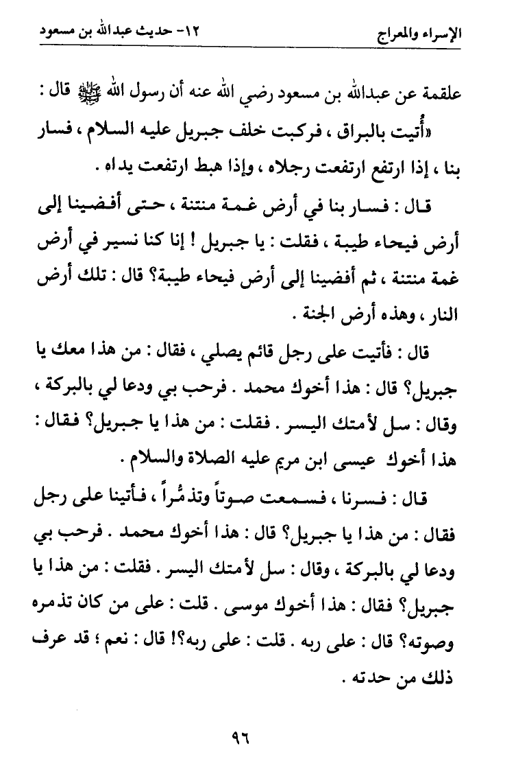قال: فأتيت على رجل قائم يصلي فقال: من هذا معك يا جبريل؟ قال: هذا أخوك محمد. فرحب بي ودعا لي بالبركة وقال: سل لأمتك اليسر. فقلت: من هذا يا جبريل؟ فقال: هذا أخوك عيسى بن مريم عليه الصلاة والسلام.