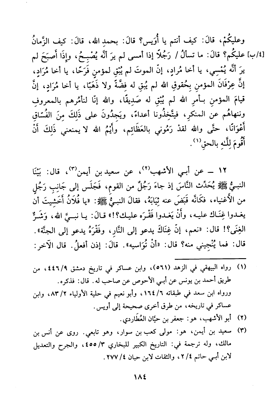 12 - عَنْ أَبِي الْأَشْهَبِ، عَنْ سَعِيدِ بْنِ أَيْمَنَ، قَالَ: بَيْنَا النَّبِيُّ صَلَّى اللهُ عَلَيْهِ وَسَلَّمَ يُحَدِّثُ النَّاسَ إِذْ جَاءَ رَجُلٌ مِنَ الْقَوْمِ، فَجَلَسَ إِلَى جَانِبِ رَجُلٍ مِنَ الْأَغْنِيَاءِ، فَكَأَنَّهُ قَبَضَ عَنْهُ ثِيَابَهُ، فَقَالَ النَّبِيُّ صَلَّى اللهُ عَلَيْهِ وَسَلَّمَ: «يَا فُلَانُ، §أَخَشِيتَ أَنْ يَغْدُوَ غِنَاكَ عَلَيْهِ، وَأَنْ يَغْدُوَ فَقْرُهُ عَلَيْكَ؟» قَالَ: يَا نَبِيَّ اللَّهِ وَشَرٌّ الْغِنَى؟ قَالَ: «نَعَمْ، إِنَّ غِنَاكَ يَدْعُو إِلَى النَّارِ، وَفَقْرَهُ يَدْعُو إِلَى الْجَنَّةِ» ، قَالَ: فَمَا يُنَجِّينِي مِنْهُ؟ قَالَ: «أَنْ تُوَاسِيَهُ» . قَالَ: إِذَنْ أَفْعَلُ، قَالَ الْآخَرُ: -[185]- لَا أَرَبَ لِي فِيهِ، قَالَ: «اسْتَغْفِرْ لِأَخِيكَ»