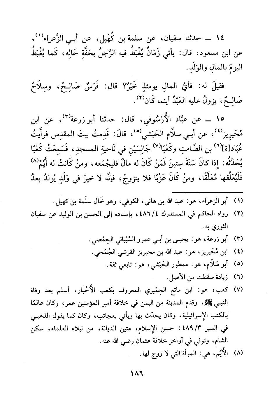 14 - حَدَّثَنَا سُفْيَانُ، عَنْ سَلَمَةَ بْنِ كُهَيْلٍ، عَنْ أَبِي الزَّعْرَاءِ، عَنِ ابْنِ مَسْعُودٍ، قَالَ: «§يَأْتِي زَمَانٌ يُغْبَطُ فِيهِ الرَّجُلُ بِخِفَّةِ حَالِهِ، كَمَا يُغْبَطُ الْيَوْمَ بِالْمَالِ وَالْوَلَدِ.» فَقِيلَ لَهُ: فَأَيُّ الْمَالِ يَوْمَئِذٍ خَيْرٌ؟ قَالَ: «فَرَسٌ صَالِحٌ، وَسِلَاحٌ صَالِحٌ، يَزُولُ عَلَيْهِ الْعَبْدُ أَيْنَمَا كَانَ»