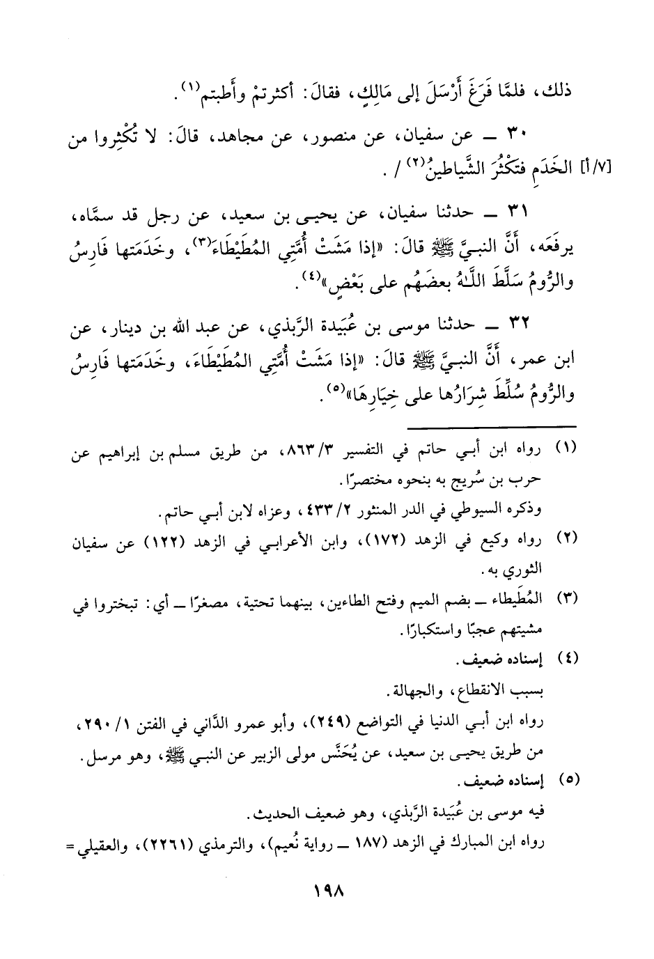 31 - حَدَّثَنَا سُفْيَانُ، عَنْ يَحْيَى بْنِ سَعِيدٍ، عَنْ رَجُلٍ، قَدْ سَمَّاهُ، يَرْفَعُهُ، أَنَّ النَّبِيَّ صَلَّى اللهُ عَلَيْهِ وَسَلَّمَ قَالَ: «§إِذَا مَشَتْ أُمَّتِي الْمُطَيْطَاءَ، وَخَدَمَتْهَا فَارِسُ وَالرُّومُ، سَلَّطَ اللَّهُ بَعْضَهُمْ عَلَى بَعْضٍ»