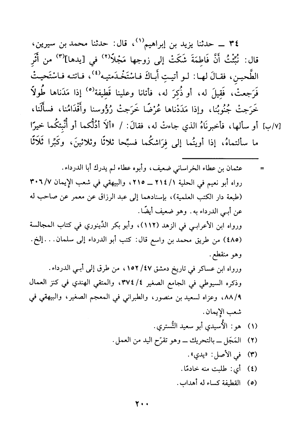 34 - حَدَّثَنَا يَزِيدُ بْنُ إِبْرَاهِيمَ، قَالَ: حَدَّثَنَا مُحَمَّدُ بْنُ سِيرِينَ، قَالَ: نُبِّئْتُ أَنَّ فَاطِمَةَ شَكَتْ إِلَى زَوْجِهَا مَجَلًا فِي يَدِهَا مِنْ أَثَرِ الطَّحِينِ، فَقَالَ لَهَا: لَوْ أَتَيْتِ أَبَاكِ فَاسْتَخْدَمْتِيهِ، فَأَتَتْهُ فَاسْتَحْيَتْ فَرَجَعَتْ، فَقِيلَ لَهُ، أَوْ ذُكِرَ لَهُ، فَأَتَانَا وَعَلَيْنَا قَطِيفَةٌ، إِذْ مَدَدْنَاهَا طُولًا خَرَجَتْ جُنُوبُنَا، وَإِذَا مَدَدْنَاهَا عَرْضًا خَرَجَتْ رُءُوسُنَا وَأَقْدَامَنَا، فَسَأَلَنَا أَوْ سَأَلَهَا، فَأَخْبَرَنَاهُ الَّذِي جَاءَتْ لَهُ، فَقَالَ: «أَلَا أَدُلُّكُمَا، أَوْ أُنْبِئُكُمَّا خَيْرًا مِمَّا سَأَلْتُمَاهُ، §إِذَا أَوَيْتُمَا إِلَى فِرَاشِكُمَا فَسَبِّحَا ثَلَاثًا وَثَلَاثِينَ، وَكَبِّرًا ثَلَاثًا -[201]- وَثَلَاثِينَ، وَاحْمَدَا أَرْبَعًا وَثَلَاثِينَ» أَوْ «كَبِّرًا أَرْبَعًا وَثَلَاثِينَ، وَاحْمَدَا ثَلَاثِينَ، فَذَلِكَ مِائَةٌ»