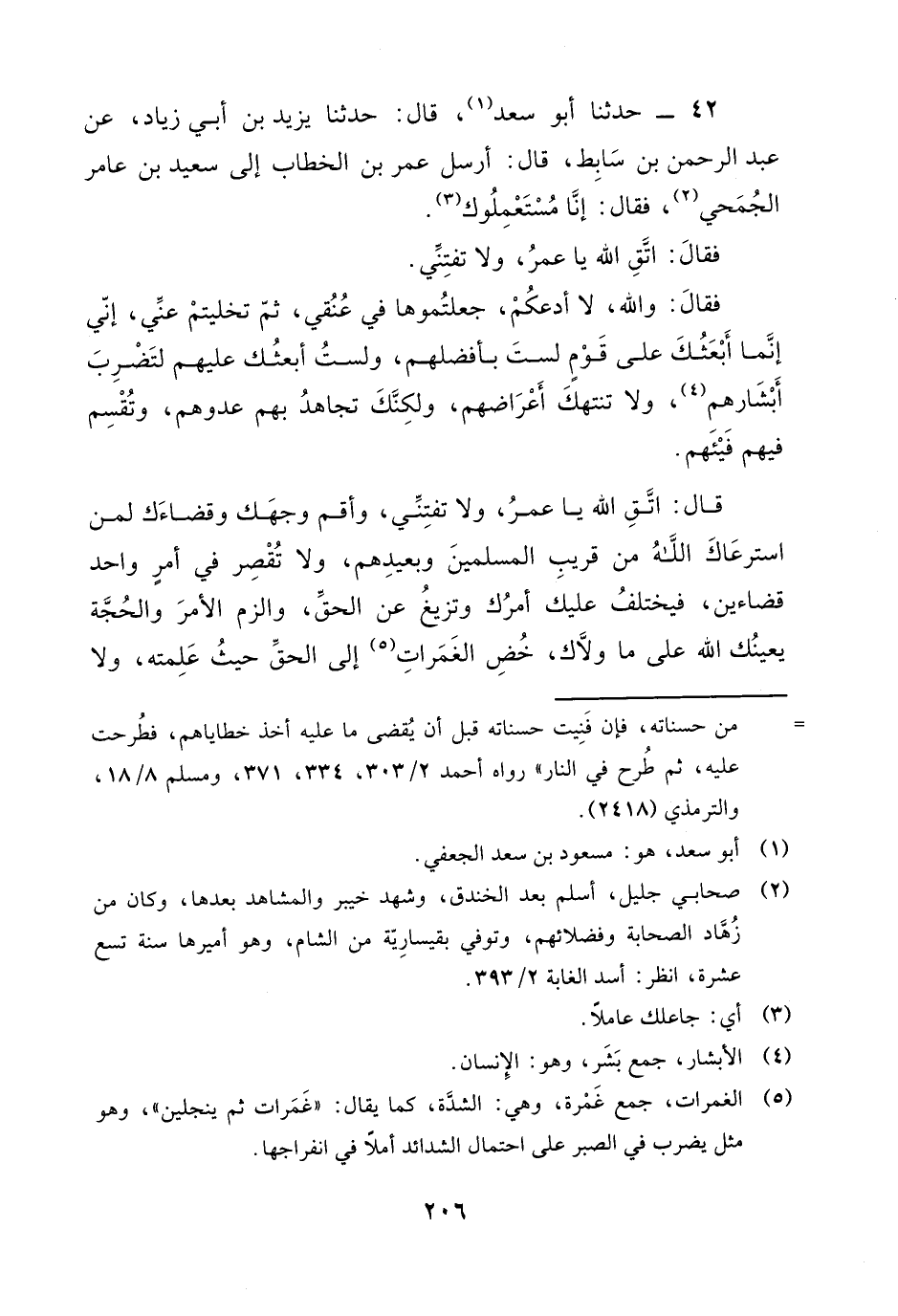 42 - حَدَّثَنَا أَبُو سَعْدٍ، قَالَ: حَدَّثَنَا يَزِيدُ بْنُ أَبِي زِيَادٍ، عَنْ عَبْدِ الرَّحْمَنِ بْنِ سَابِطٍ، قَالَ: أَرْسَلَ عُمَرُ بْنُ الْخَطَّابِ إِلَى سَعِيدِ بْنِ عَامِرٍ الْجُمَحِيِّ، فَقَالَ: إِنَّا مُسْتَعْمِلُوكَ. فَقَالَ: اتَّقِ اللَّهَ يَا عُمَرُ، وَلَا تَفْتِنِّي. فَقَالَ: وَاللَّهِ لَا أَدْعُكُمْ، جَعَلْتُمُوهَا فِي عُنُقِي، ثُمَّ تَخَلَّيْتُمْ عَنِّي، إِنِّي إِنَّمَا أَبْعَثُكَ عَلَى قَوْمٍ لَسْتَ بِأَفْضَلِهِمْ، وَلَسْتُ أَبْعَثُكَ عَلَيْهِمْ لِتَضْرِبَ أَبْشَارَهُمْ، وَلَا تَنْتَهِكَ أَعْرَاضَهُمْ، وَلَكِنَّكَ تُجَاهِدُ بِهِمْ عَدُوَّهُمْ، وَتُقْسِمُ فِيهِمْ فَيْئَهُمْ. قَالَ: اتَّقِ اللَّهَ يَا عُمَرُ، وَلَا تَفْتِنِّي، وَأَقِمْ وَجْهَكَ وَقَضَاءَكَ لِمَنِ اسْتَرْعَاكَ اللَّهُ مِنْ قَرِيبِ الْمُسْلِمِينَ وَبَعِيدِهِمْ، وَلَا تُقْصِرْ فِي أَمْرٍ وَاحِدٍ قَضَاءَيْنِ، فَيَخْتَلِفَ عَلَيْكَ أَمْرُكَ وَتَزِيغَ عَنِ الْحَقِّ، وَالْزَمِ الْأَمْرَ وَالْحُجَّةَ يُعِينُكَ اللَّهُ عَلَى مَا وَلَّاكَ، خُضِ الْغَمَرَاتِ إِلَى الْحَقِّ حَيْثُ عَلِمْتَهُ، وَلَا -[207]- تَخْشَ فِي اللَّهِ لَوْمَةَ لَائِمٍ. قَالَ عُمَرُ: وَيْحَكَ، مَنْ يُطِيقُ هَذَا يَا سَعِيدُ بْنَ عَامِرٍ؟ قَالَ: مَنْ قَطَعَ اللَّهُ فِي عُنُقِهِ مِثْلَ الَّذِي قَطَعَ فِي عُنُقِكَ، إِنَّمَا عَلَيْكَ أَنْ تَأْمُرَ فَيُطَاعَ أَمْرُكَ أَوْ يُتْرَكَ، فَتَكُونَ لَكَ الْحُجَّةُ، قَالَ عُمَرُ: إِنَّا سَنَجْعَلُ لَكَ رِزْقًا، قَالَ: قَدْ جُعِلَ لِي مَا يَكْفِينِي دُونَهُ، وَمَا أَنَا مُزْدَادٌ مِنْ مَالِ الْمُسْلِمِينَ شَيْئًا، يَعْنِي عَطَاءَهُ. فَكَانَ إِذَا خَرَّجَ عَطَاءَهُ نَظَرَ إِلَى قُوتِ أَهْلِهِ مِنْ طَعَامِهِمْ وَشَرَابِهِمْ فَعَزَلَهُ، وَنَظَرَ إِلَى بَقِيَّتِهِ فَتَصَدَّقَ بِهِ، فَيُقَالُ لَهُ: أَيْنَ مَالُكَ؟ فَيَقُولُ: أَقْرَضْتُهُ، فَأَتَى نَاسٌ مِنْ قَوْمِهِ، فَقَالُوا لَهُ: إِنَّ لِقَوْمِكَ عَلَيْكَ حَقًّا. قَالَ: مَا أَسْتَأْثِرُ عَلَيْهِمْ وَإِنَّ يَدَيَّ مَعَ أَيْدِيهِمْ، وَمَا أَنَا بِطَالِبٍ رِضَى أَحَدٍ مِنَ النَّاسِ بِطِلْبَتِي الْحُورَ الْعَيْنِ، لَوِ اطَّلَعَتْ مِنْهُنَّ وَاحِدَةٌ لَأَشْرَقَتْ لَهَا الْأَرْضُ كَمَا تُشْرِقُ الشَّمْسُ لِأَهْلِ الدُّنْيَا، وَمَا أَنَا مُتَخَلِّفٌ عَنِ الْعُنُقِ الْأَوَّلِ، بَعْدَ أَنْ سَمِعْتُ رَسُولَ اللَّهِ صَلَّى اللهُ عَلَيْهِ وَسَلَّمَ يَقُولُ: " §يَجِيءُ فُقَرَاءُ الْمُسْلِمِينَ يُزَفُّونَ كَمَا تُزَفُّ الْحَمَّامُ، فَيُقَالُ لَهُمْ: قِفُوا لِلْحِسَابِ، فَيَقُولُونَ: وَاللَّهِ مَا تَرَكْنَا شَيْئًا نُحَاسَبُ عَلَيْهِ، فَيَقُولُ اللَّهُ عَزَّ وَجَلَّ: صَدَقَ عِبَادِي، فَيَدْخُلُونَ -[208]- الْجَنَّةَ قَبْلَ سَبْعِينَ "، أَوْ قَالَ: «أَرْبَعِينَ عَامًا»