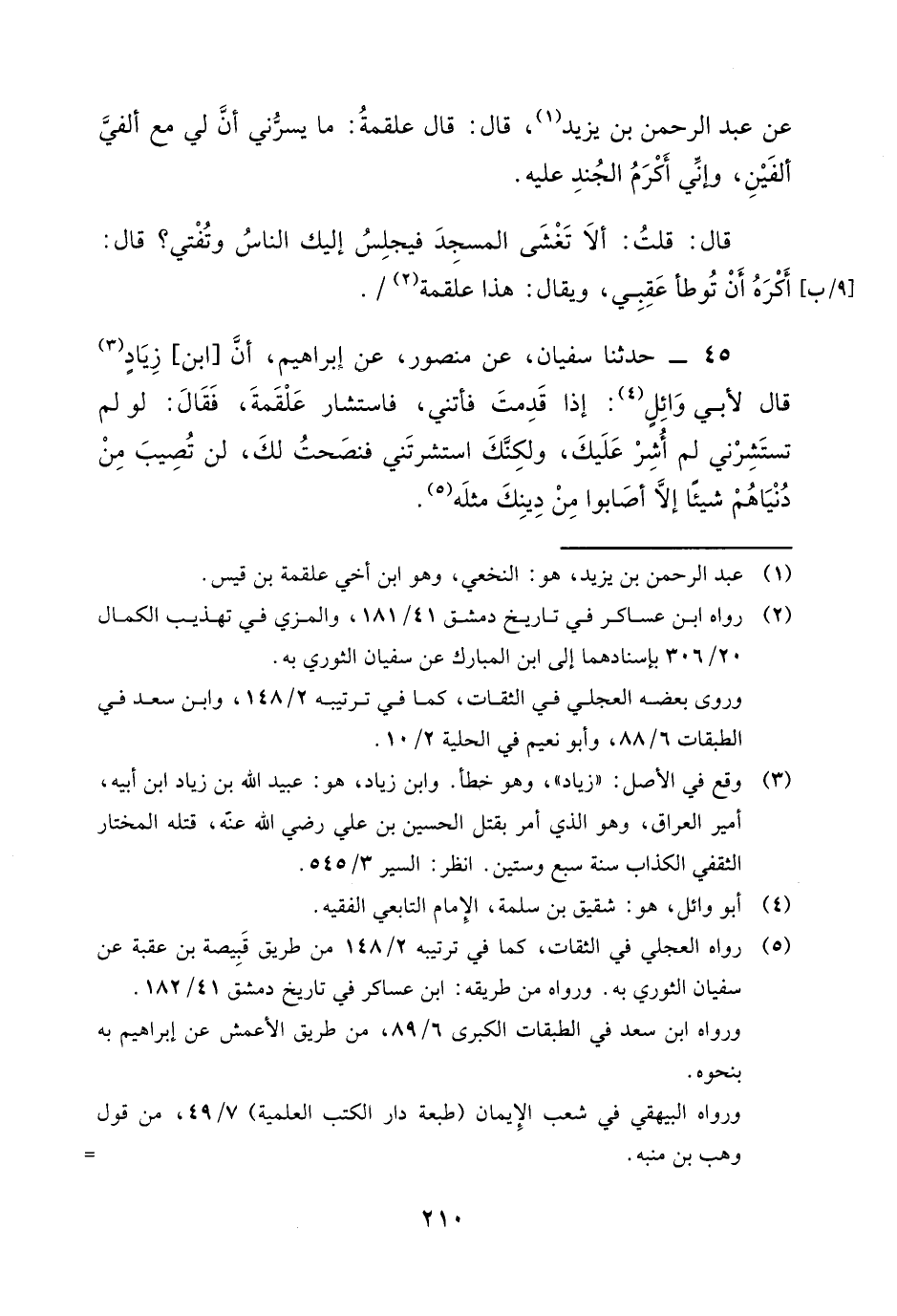 45 - حَدَّثَنَا سُفْيَانُ، عَنْ مَنْصُورٍ، عَنْ إِبْرَاهِيمَ، أَنَّ ابْنَ زِيَادٍ قَالَ لِأَبِي وَائِلٍ: إِذَا قَدِمْتَ فَأْتِنِي، فَاسْتَشَارَ عَلْقَمَةَ، فَقَالَ: «لَوْ لَمْ تَسْتَشِرْنِي لَمْ أُشِرْ عَلَيْكَ، وَلَكِنَّكَ اسْتَشَرْتَنِي فَنَصَحْتُ لَكَ، §لَنْ تُصِيبَ مِنْ دُنْيَاهُمْ شَيْئًا إِلَّا أَصَابُوا مِنْ دِينِكِ مِثْلَهُ»
