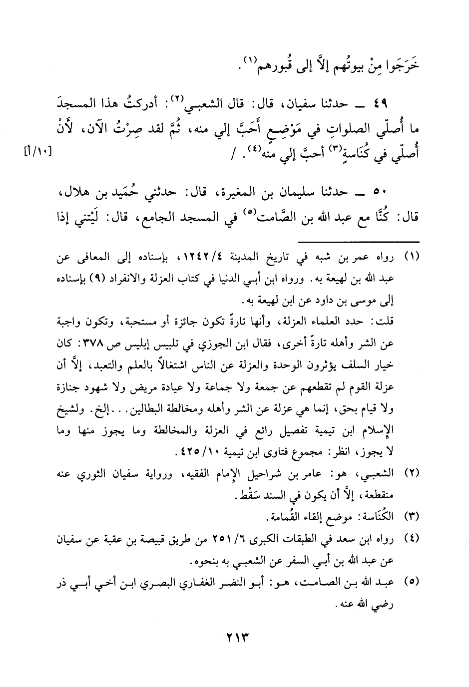 49 - حَدَّثَنَا سُفْيَانُ، قَالَ: قَالَ الشَّعْبِيُّ: «§أَدْرَكْتُ هَذَا الْمَسْجِدَ مَا أُصَلِّي الصَّلَوَاتِ فِي مَوْضِعٍ أَحَبَّ إِلَيَّ مِنْهُ، ثُمَّ لَقَدْ صِرْتُ الْآنَ لَأَنْ أُصَلِّيَ فِي كُنَاسَةٍ أَحَبُّ إِلَيَّ مِنْهُ»