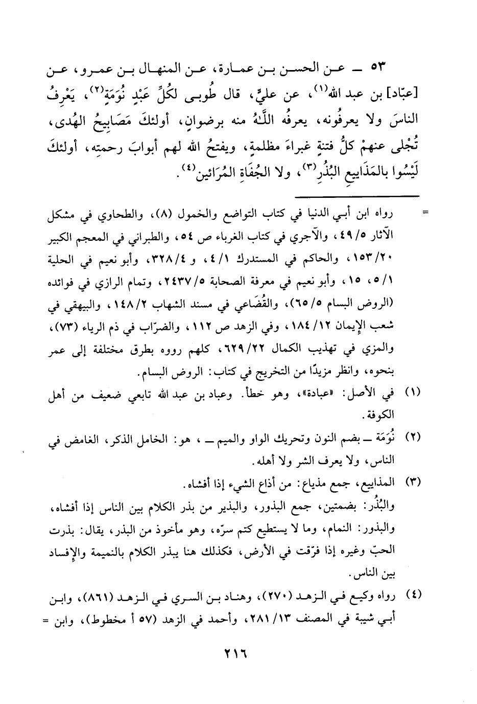 53 - عَنِ الْحَسَنِ بْنِ عُمَارَةَ، عَنِ الْمِنْهَالِ بْنِ عَمْرٍو، عَنْ عَبَّادِ بْنِ عَبْدِ اللَّهِ، عَنْ عَلِيٍّ، قَالَ: «§طُوبَى لِكُلِّ عَبْدٍ نُوَمَةٍ، يَعْرِفُ النَّاسَ وَلَا يَعْرِفُونَهُ، يَعْرِفُهُ اللَّهُ مِنْهُ بِرِضْوَانٍ، أُولَئِكَ مَصَابِيحُ الْهُدَى، تُجْلَى عَنْهُمْ كُلُّ فِتْنَةٍ غَبْرَاءَ مُظْلِمَةٍ، وَيَفْتَحُ اللَّهُ لَهُمْ أَبْوَابَ رَحْمَتِهِ، أُولَئِكَ لَيْسُوا بِالْمَذَايِيعِ الْبُذُرِ، وَلَا الْجُفَاةِ الْمُرَائِينَ»