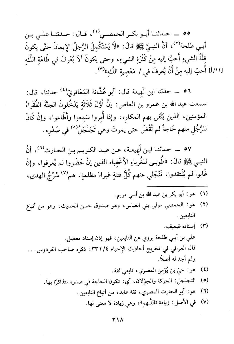 55 - حَدَّثَنَا أَبُو بَكْرٍ الْحِمْصِيُّ، قَالَ: حَدَّثَنَا عَلِيُّ بْنُ أَبِي طَلْحَةَ، أَنَّ النَّبِيَّ صَلَّى اللهُ عَلَيْهِ وَسَلَّمَ قَالَ: «§لَا يَسْتَكْمِلُ الرَّجُلُ الْإِيمَانَ حَتَّى يَكُونَ قِلَّةُ الشَّيْءِ أَحَبَّ إِلَيْهِ مِنْ كَثْرَةِ الشَّيْءِ، وَحَتَّى يَكُونَ أَلَّا يُعْرَفُ فِي طَاعَةِ اللَّهِ أَحَبَّ إِلَيْهِ مِنْ أَنْ يُعْرَفَ فِي مَعْصِيَةِ اللَّهِ»