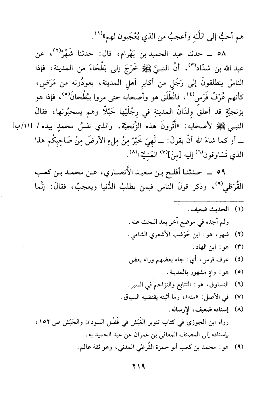 58 - حَدَّثَنَا عَبْدُ الْحَمِيدِ بْنُ بَهْرَامَ، قَالَ: حَدَّثَنَا شَهْرٌ، عَنْ عَبْدِ اللَّهِ بْنِ شَدَّادٍ، أَنَّ النَّبِيَّ صَلَّى اللهُ عَلَيْهِ وَسَلَّمَ خَرَجَ إِلَى بَطْحَاءَ مِنَ الْمَدِينَةِ، فَإِذَا النَّاسُ يَنْطَلِقُونَ إِلَى رَجُلٍ مِنْ أَكَابِرِ أَهْلِ الْمَدِينَةِ، يَعُودُونَهُ مِنْ مَرَضٍ، كَأَنَّهُمْ عُرْفُ فَرَسٍ، فَانْطَلَقَ هُوَ وَأَصْحَابُهُ حَتَّى مَرُّوا بِبُطْحَانَ، فَإِذَا هُوَ بِزِنْجِيَّةٍ قَدْ أَعْلَقَ وِلْدَانُ الْمَدِينَةِ فِي رِجْلَيْهَا حَبْلًا وَهُمْ يَسْحَبُونَهَا، فَقَالَ النَّبِيُّ صَلَّى اللهُ عَلَيْهِ وَسَلَّمَ لِأَصْحَابِهِ: " أَتَرَوْنَ هَذِهِ الزِّنْجِيَّةَ، وَالَّذِي نَفْسُ مُحَمَّدٍ بِيَدِهِ - أَوْ كَمَا شَاءَ اللَّهُ أَنْ يَقُولَ: - §لَهِيَ خَيْرٌ مِنْ مِلْءِ الْأَرْضِ مِنْ صَاحِبِكُمْ هَذَا الَّذِي تَسَاوَقُونَ إِلَيْهِ مِنَ الْعَشِيَّةِ "