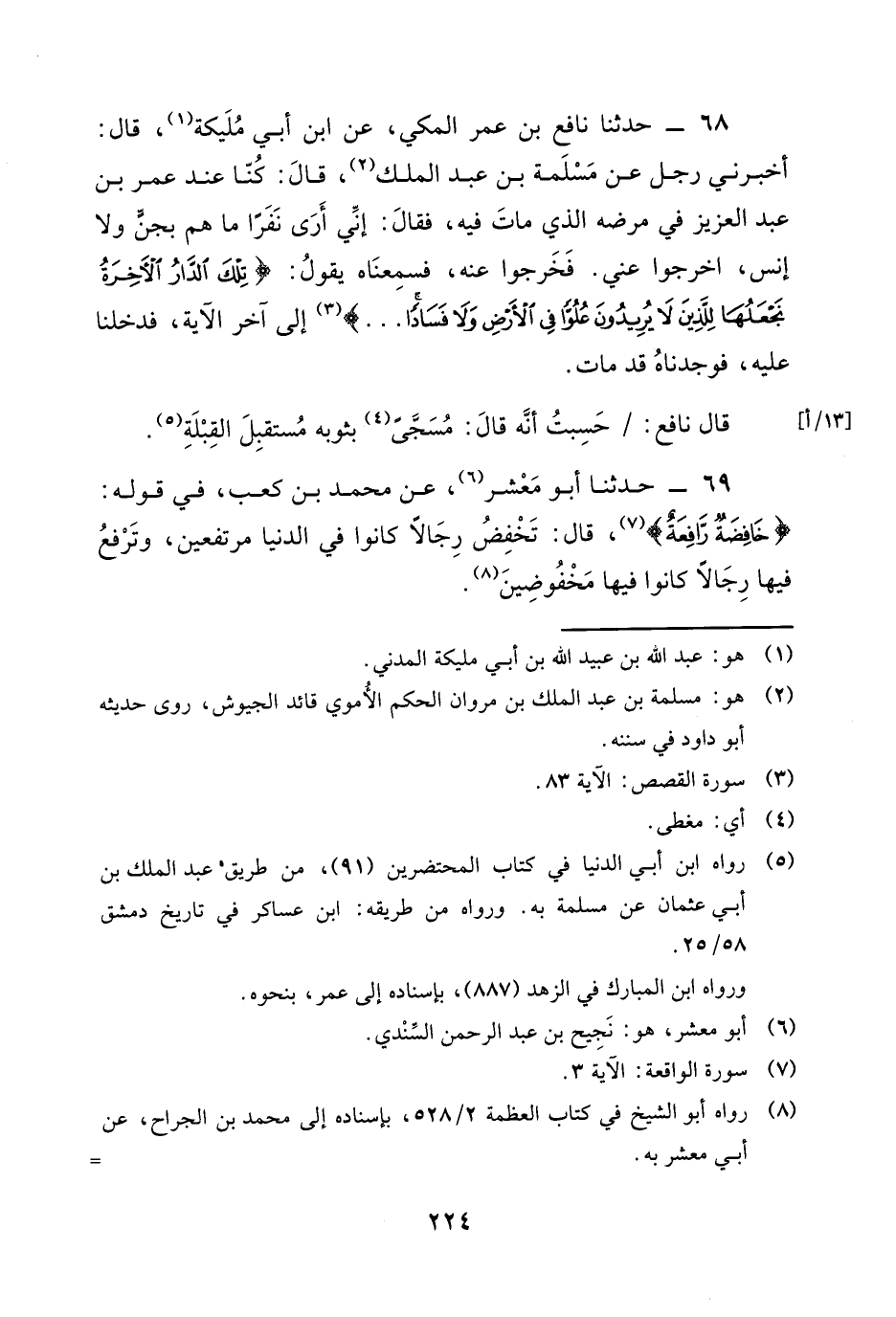 68 - حَدَّثَنَا نَافِعُ بْنُ عُمَرَ الْمَكِّيُّ، عَنِ ابْنِ أَبِي مُلَيْكَةَ، قَالَ: أَخْبَرَنِي رَجُلٌ، عَنْ مَسْلَمَةَ بْنِ عَبْدِ الْمَلِكِ، قَالَ: كُنَّا عِنْدَ عُمَرَ بْنِ عَبْدِ الْعَزِيزِ فِي مَرَضِهِ الَّذِي مَاتَ فِيهِ، فَقَالَ: إِنِّي أَرَى نَفَرًا مَا هُمْ بِجِنٍّ وَلَا إِنْسٍ، اخْرُجُوا عَنِّي، فَخَرَجُوا عَنْهُ، فَسَمِعْنَاهُ يَقُولُ: {§تِلْكَ الدَّارُ الْآخِرَةُ نَجْعَلُهَا لِلَّذِينَ لَا يُرِيدُونَ عَلُوًّا فِي الْأَرْضِ وَلَا فَسَادًا} [القصص: 83] . إِلَى آخِرِ الْآيَةِ، فَدَخَلْنَا عَلَيْهِ، فَوَجَدْنَاهُ قَدْ مَاتَ. قَالَ نَافِعٌ: حَسِبْتُ أَنَّهُ قَالَ: مُسَجًّى بِثَوْبِهِ مُسْتَقْبِلَ الْقِبْلَةِ