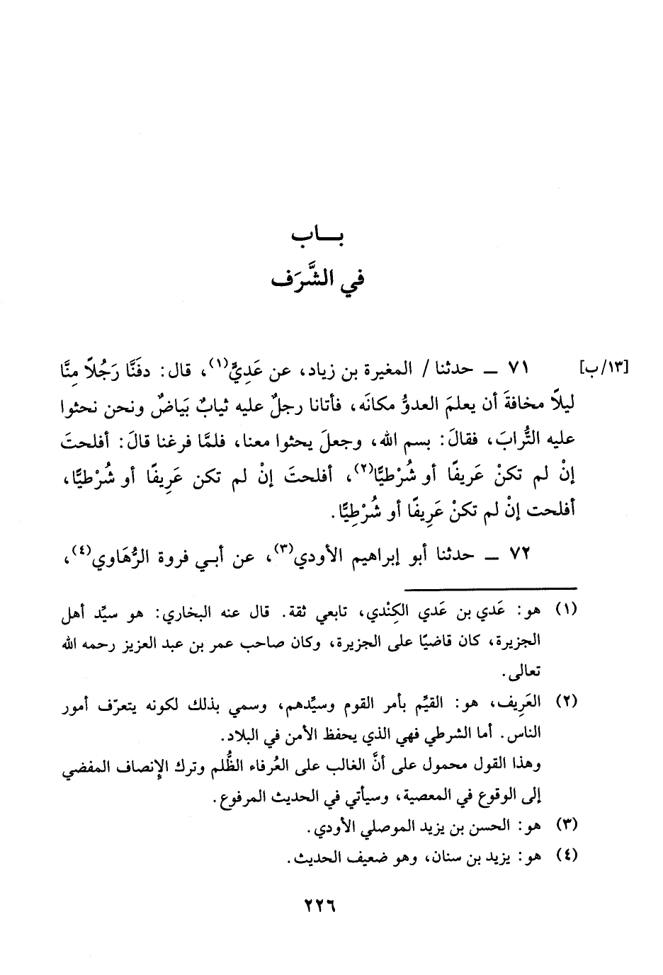 71 - حَدَّثَنَا الْمُغِيرَةُ بْنُ زِيَادٍ، عَنْ عَدِيٍّ، قَالَ: دَفَنَّا رَجُلًا مِنَّا لَيْلًا مَخَافَةَ أَنْ يَعْلَمَ الْعَدُوُّ مَكَانَهُ، فَأَتَانَا رَجُلٌ عَلَيْهِ ثِيَابٌ بَيَاضٌ وَنَحْنُ نَحْثُوا عَلَيْهِ التُّرَابَ، فَقَالَ: بِسْمِ اللَّهِ، وَجَعَلَ يَحْثُوا مَعَنَا، فَلَمَّا فَرَغْنَا قَالَ: «§أَفْلَحْتَ إِنْ لَمْ تَكُنْ عَرِيفًا أَوْ شُرَطِيًّا، أَفْلَحْتَ إِنْ لَمْ تَكُنْ عَرِيفًا أَوْ شُرَطِيًّا، أَفْلَحْتَ إِنْ لَمْ تَكُنْ عَرِيفًا أَوْ شُرَطِيًّا»