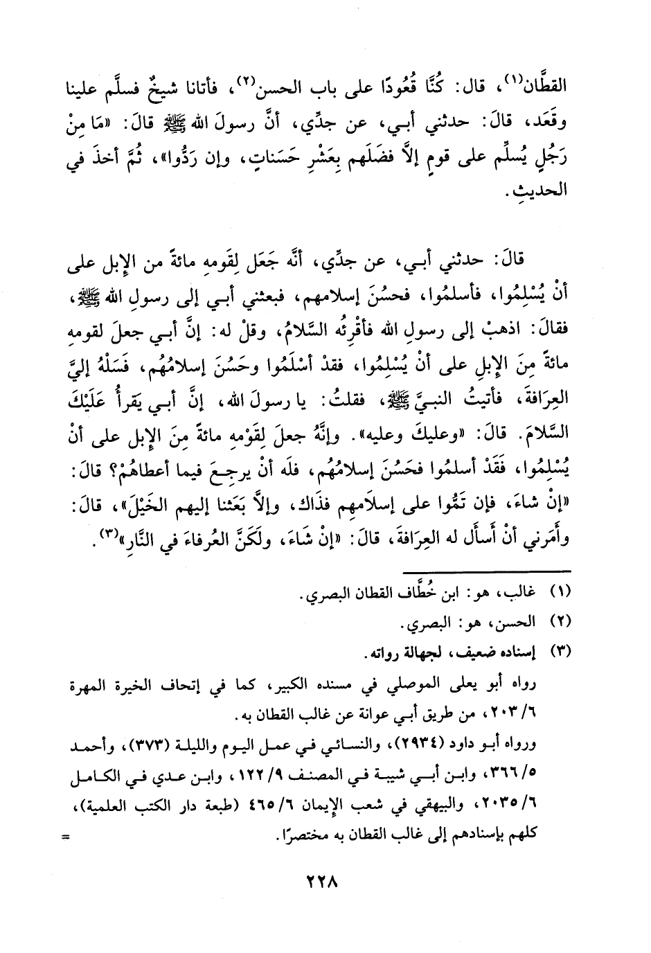 ثُمَّ أَخَذَ فِي الْحَدِيثِ. قَالَ: حَدَّثَنِي أَبِي، عَنْ جَدِّي، أَنَّهُ جَعَلَ لِقَوْمِهِ مِائَةً مِنَ الْإِبِلِ عَلَى أَنْ يُسْلِمُوا، فَأَسْلَمُوا، فَحَسُنَ إِسْلَامُهُمْ، فَبَعَثَنِي أَبِي إِلَى رَسُولِ اللَّهِ صَلَّى اللهُ عَلَيْهِ وَسَلَّمَ، فَقَالَ: اذْهَبْ إِلَى رَسُولِ اللَّهِ، فَأَقْرِئْهُ السَّلَامَ، وَقُلْ لَهُ: إِنَّ أَبِي جَعَلَ لِقَوْمِهِ مِائَةً مِنَ الْإِبِلِ عَلَى أَنْ يُسْلِمُوا، فَقَدْ أَسْلَمُوا وَحَسُنَ إِسْلَامُهُمْ، فَسَلْهُ إِلَيَّ الْعِرَافَةَ، فَأَتَيْتُ النَّبِيَّ صَلَّى اللهُ عَلَيْهِ وَسَلَّمَ، فَقُلْتُ: يَا رَسُولَ اللَّهِ، إِنَّ أَبِي يَقْرَأُ عَلَيْكَ السَّلَامَ، قَالَ: «وَعَلَيْكَ وَعَلَيْهِ» ، وَإِنَّهُ جَعَلَ لِقَوْمِهِ مِائَةً مِنَ الْإِبِلِ عَلَى أَنْ يُسْلِمُوا، فَقَدْ أَسْلَمُوا فَحَسُنَ إِسْلَامُهُمْ، فَلَهُ أَنْ يَرْجِعَ فِيمَا أَعْطَاهُمْ؟ قَالَ: «إِنْ شَاءَ، فَإِنْ تَمُّوا عَلَى إِسْلَامِهِمْ فَذَاكَ، وَإِلَّا بَعَثْنَا إِلَيْهِمُ الْخَيْلَ» قَالَ: وَأَمَرَنِي أَنْ أَسْأَلَ لَهُ الْعِرَافَةَ. قَالَ: «إِنْ شَاءَ، وَلَكِنَّ §الْعُرَفَاءَ فِي النَّارِ»