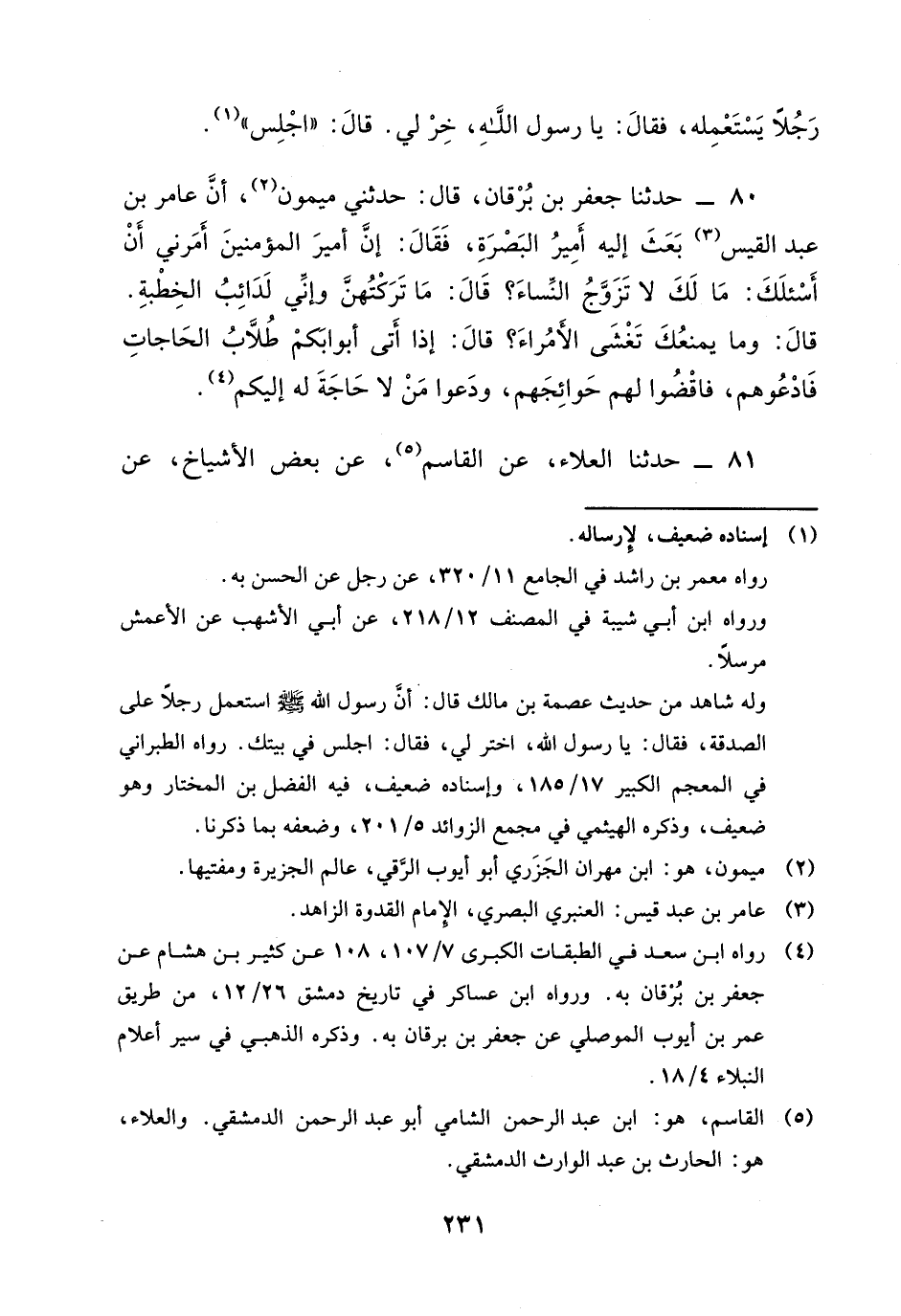 80 - حَدَّثَنَا جَعْفَرُ بْنُ بُرْقَانَ، قَالَ: حَدَّثَنِي مَيْمُونٌ، أَنَّ عَامِرَ بْنَ عَبْدِ قَيْسٍ بَعَثَ إِلَيْهِ أَمِيرُ الْبَصْرَةِ، فَقَالَ: إِنَّ أَمِيرَ الْمُؤْمِنِينَ أَمَرَنِي أَنْ أَسْأَلَكَ: مَا لَكَ لَا تَزَوَّجُ النِّسَاءَ؟ قَالَ: «مَا تَرَكْتُهُنَّ، وَإِنِّي لَدَائِبُ الْخِطْبَةِ» قَالَ: وَمَا يَمْنَعُكَ تَغْشَى الْأُمَرَاءَ؟ قَالَ: «§إِذَا أَتَى أَبْوَابَكُمْ طُلَّابُ الْحَاجَاتِ فَادْعُوهُمْ، فَاقْضُوا لَهُمْ حَوَائِجَهُمْ، وَدَعُوا مَنْ لَا حَاجَةَ لَهُ إِلَيْكُمْ»