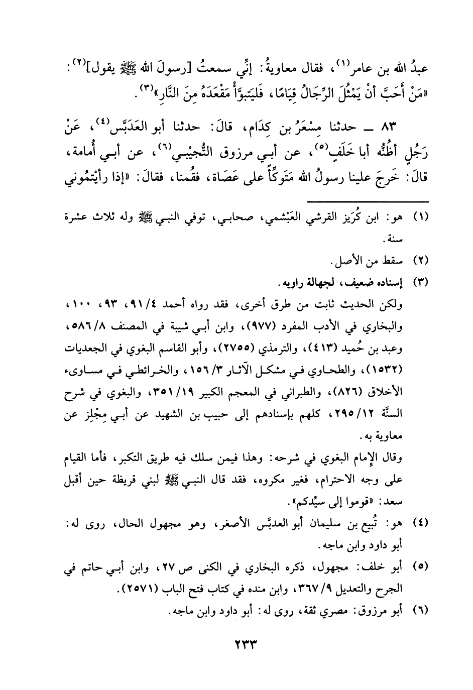 83 - حَدَّثَنَا مِسْعَرُ بْنُ كِدَامٍ، قَالَ: حَدَّثَنَا أَبُو الْعَدَبَّسِ، عَنْ رَجُلٍ، أَظُنُّهُ أَبَا خَلَفٍ، عَنْ أَبِي مَرْزُوقٍ التُّجِيبِيِّ، عَنْ أَبِي أُمَامَةَ، قَالَ: خَرَجَ عَلَيْنَا رَسُولُ اللَّهِ مُتَوَكِّئًا عَلَى عَصَاهُ، فَقُمْنَا، فَقَالَ: «§إِذَا رَأَيْتُمُونِي -[234]- فَلَا تَقُومُوا، كَمَا تُعَظِّمُ الْأَعَاجِمُ بَعْضُهَا بَعْضًا»