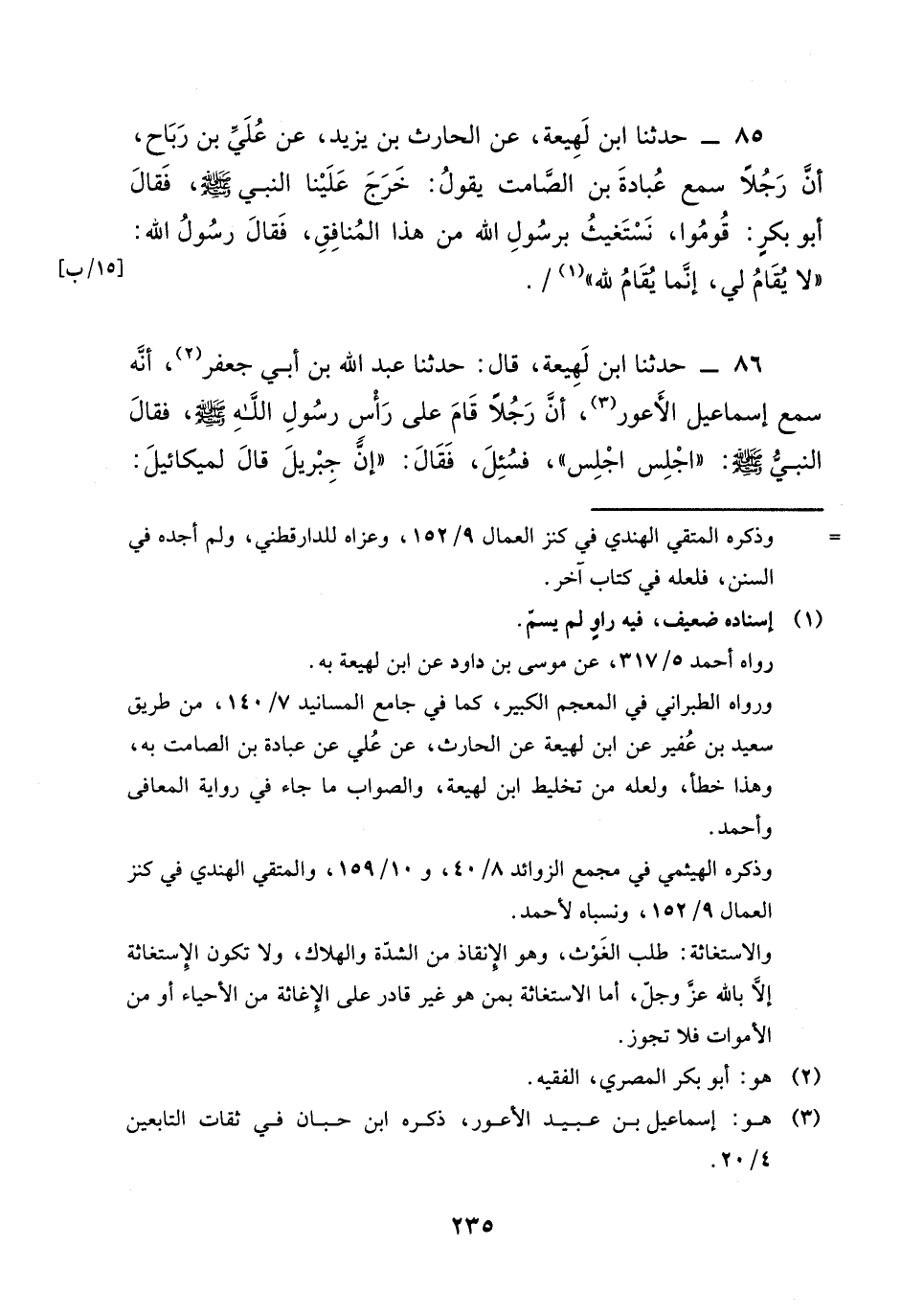 85 - حَدَّثَنَا ابْنُ لَهِيعَةَ، عَنِ الْحَارِثِ بْنِ يَزِيدَ، عَنْ عَلِيِّ بْنِ رَبَاحٍ، أَنَّ رَجُلًا، سَمِعَ عُبَادَةَ بْنَ الصَّامِتِ، يَقُولُ: خَرَجَ عَلَيْنَا النَّبِيُّ صَلَّى اللهُ عَلَيْهِ وَسَلَّمَ، فَقَالَ أَبُو بَكْرٍ: قُومُوا نَسْتَغِيثُ بِرَسُولِ اللَّهِ مِنْ هَذَا الْمُنَافِقِ، فَقَالَ رَسُولُ اللَّهِ صَلَّى اللهُ عَلَيْهِ وَسَلَّمَ: «§لَا يُقَامُ لِي، إِنَّمَا يُقَامُ لِلَّهِ»