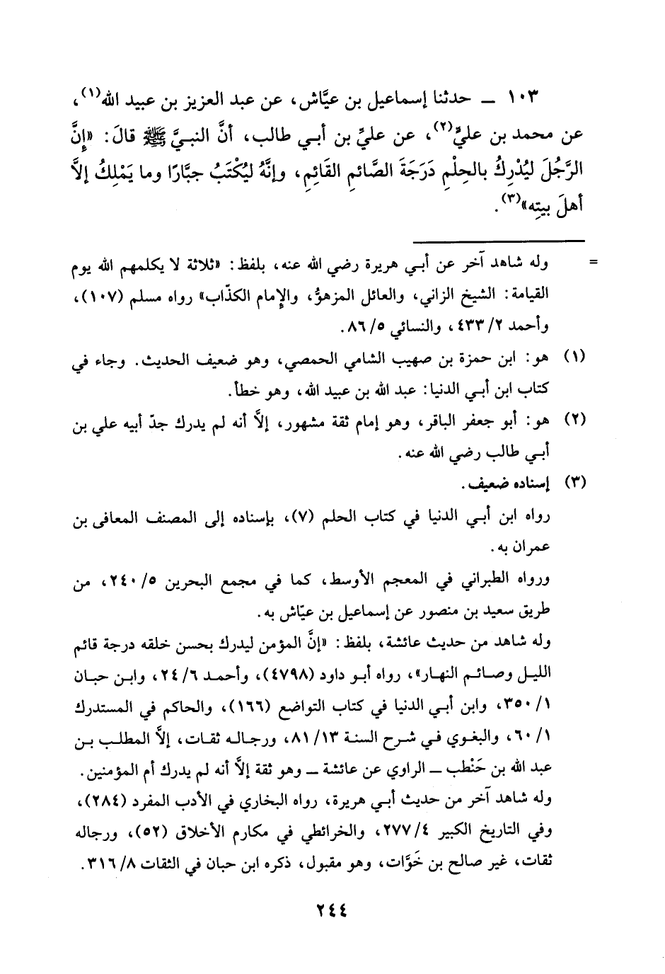 103 - حَدَّثَنَا إِسْمَاعِيلُ بْنُ عَيَّاشٍ، عَنْ عَبْدِ الْعَزِيزِ بْنِ عُبَيْدِ اللَّهِ، عَنْ مُحَمَّدِ بْنِ عَلِيٍّ، عَنْ عَلِيِّ بْنِ أَبِي طَالِبٍ، أَنَّ النَّبِيَّ صَلَّى اللهُ عَلَيْهِ وَسَلَّمَ قَالَ: «§إِنَّ الرَّجُلَ لَيُدْرِكُ بِالْحِلْمِ دَرَجَةَ الصَّائِمِ الْقَائِمِ، وَإِنَّهُ لِيُكْتَبُ جَبَّارًا وَمَا يَمْلِكُ إِلَّا أَهْلَ بَيْتِهِ»