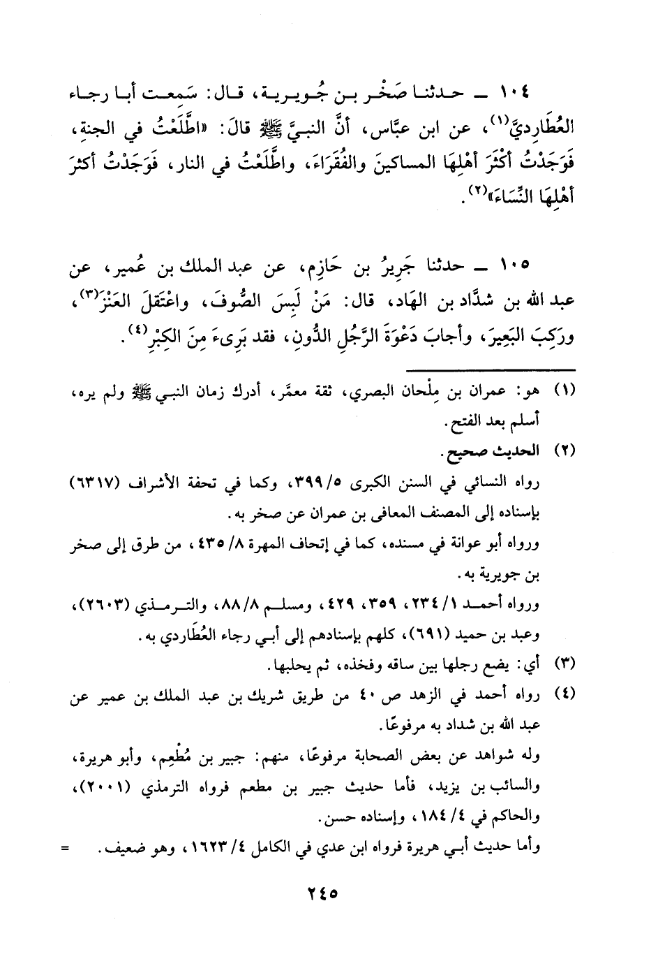 104 - حَدَّثَنَا صَخْرُ بْنُ جُوَيْرِيَةَ، قَالَ: سَمِعْتُ أَبَا رَجَاءٍ الْعُطَارِدِيَّ، عَنِ ابْنِ عَبَّاسٍ، أَنَّ النَّبِيَّ صَلَّى اللهُ عَلَيْهِ وَسَلَّمَ قَالَ: «§اطَّلَعْتُ فِي الْجَنَّةِ، فَوَجَدْتُ أَكْثَرَ أَهْلِهَا الْمَسَاكِينَ وَالْفُقَرَاءَ، وَاطَّلَعْتُ فِي النَّارِ، فَوَجَدْتُ أَكْثَرَ أَهْلِهَا النِّسَاءَ»