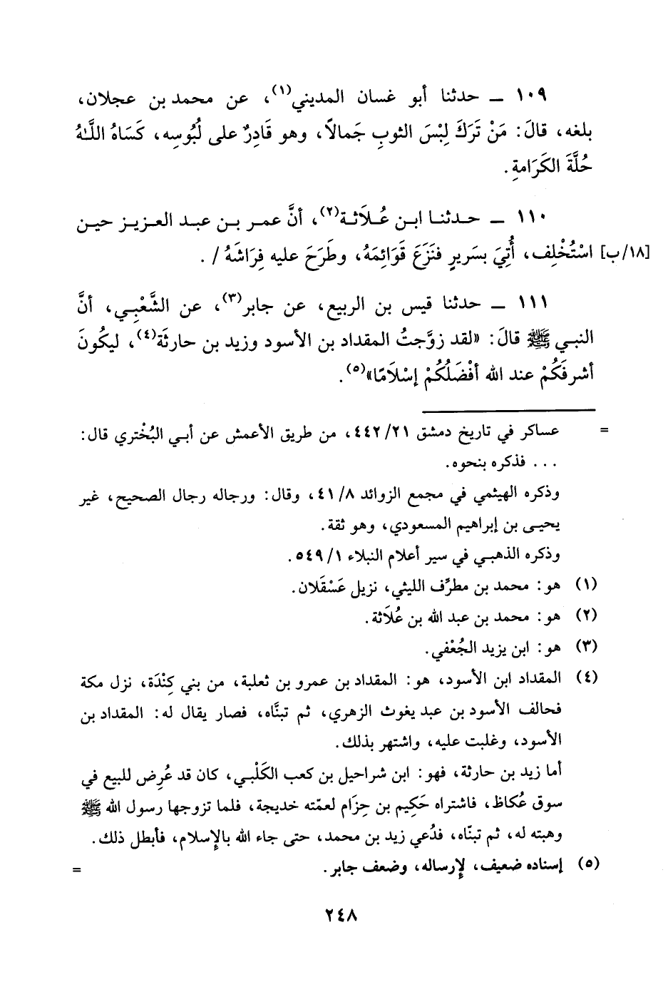 111 - حَدَّثَنَا قَيْسُ بْنُ الرَّبِيعِ، عَنْ جَابِرٍ، عَنِ الشَّعْبِيِّ، أَنَّ النَّبِيَّ صَلَّى اللهُ عَلَيْهِ وَسَلَّمَ قَالَ: «لَقَدْ §زَوَّجْتُ الْمِقْدَادَ بْنَ الْأَسْوَدِ، وَزَيْدَ بْنَ حَارِثَةَ، لِيَكُونَ أَشْرَفَكُمْ عِنْدَ اللَّهِ أَفْضَلُكُمْ إِسْلَامًا»