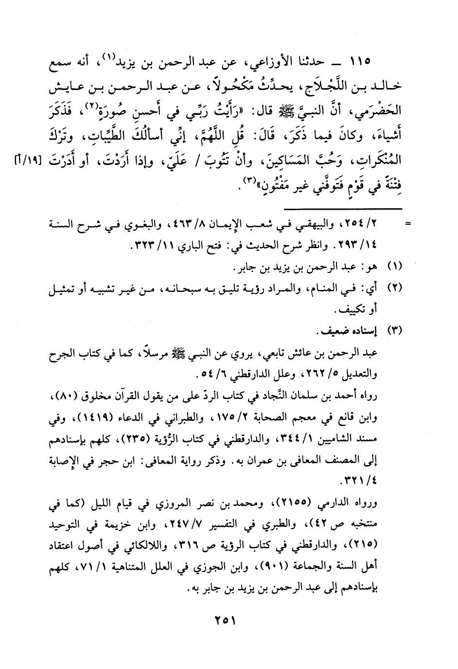 115 - حَدَّثَنَا الْأَوْزَاعِيُّ، عَنْ عَبْدِ الرَّحْمَنِ بْنِ يَزِيدَ، أَنَّهُ سَمِعَ خَالِدَ بْنَ اللَّجْلَاجِ، يُحَدِّثُ مَكْحُولًا، عَنْ عَبْدِ الرَّحْمَنِ بْنِ عَائِشٍ الْحَضْرَمِيِّ، أَنَّ النَّبِيَّ صَلَّى اللهُ عَلَيْهِ وَسَلَّمَ قَالَ: " رَأَيْتُ رَبِّيَ فِي أَحْسَنِ صُورَةٍ، فَذَكَرَ أَشْيَاءَ، وَكَانَ فِيمَا ذَكَرَ، قَالَ: قُلِ §اللَّهُمَّ إِنِّي أَسْأَلُكَ الطَّيِّبَاتِ، وَتَرْكَ الْمُنْكَرَاتِ، وَحُبَّ الْمَسَاكِينِ، وَأَنْ تَتُوبَ عَلَيَّ، وَإِذَا أَرَدْتَ، أَوْ أَدَرْتَ فِتْنَةً فِي قَوْمٍ فَتَوَفَّنِي غَيْرَ مَفْتُونٍ "