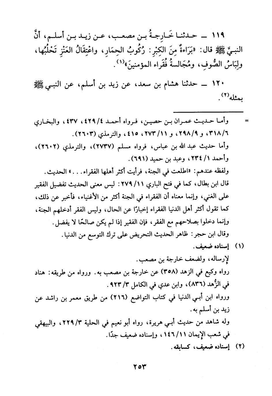 119 - حَدَّثَنَا خَارِجَةُ بْنُ مُصْعَبٍ، عَنْ زَيْدِ بْنِ أَسْلَمَ، أَنَّ النَّبِيَّ صَلَّى اللهُ عَلَيْهِ وَسَلَّمَ قَالَ: " §بَرَاءَةٌ مِنَ الْكِبْرِ: رُكُوبُ الْحِمَارِ، وَاعْتِقَالُ الْعَنْزِ تَحْلُبُهَا، وَلِبَاسُ الصُّوفِ، وَمُجَالَسَةُ فُقَرَاءِ الْمُؤْمِنِينَ ".