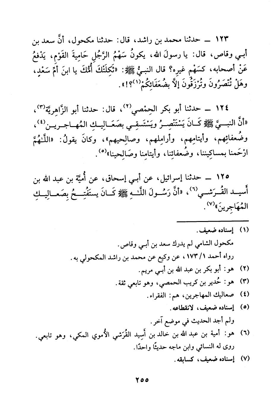 123 - حَدَّثَنَا مُحَمَّدُ بْنُ رَاشِدٍ، قَالَ: حَدَّثَنَا مَكْحُولٌ، أَنَّ سَعْدَ بْنَ أَبِي وَقَّاصٍ، قَالَ: يَا رَسُولَ اللَّهِ يَكُونُ سَهْمُ الرَّجُلِ حَامِيَةَ الْقَوْمِ، يَدْفَعُ عَنْ أَصْحَابِهِ، كَسَهْمِ غَيْرِهِ؟، قَالَ النَّبِيُّ صَلَّى اللهُ عَلَيْهِ وَسَلَّمَ: «ثَكِلَتْكَ أُمُّكَ يَا ابْنَ أُمِّ سَعْدٍ، §وَهَلْ تُنْصَرُونَ وَتُرْزَقُونَ إِلَّا بِضُعَفَائِكُمْ؟»