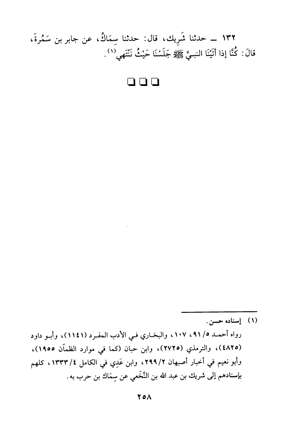 132 - حَدَّثَنَا شَرِيكٌ، قَالَ: حَدَّثَنَا سِمَاكٌ، عَنْ جَابِرِ بْنِ سَمُرَةَ، قَالَ: «§كُنَّا إِذَا أَتَيْنَا النَّبِيَّ صَلَّى اللهُ عَلَيْهِ وَسَلَّمَ جَلَسْنَا حَيْثُ نَنْتَهِي»