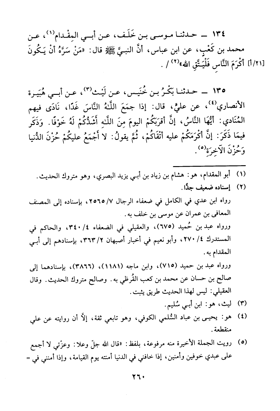 134 - حَدَّثَنَا مُوسَى بْنُ خَلَفٍ، عَنْ أَبِي الْمِقْدَامِ، عَنْ مُحَمَّدِ بْنِ كَعْبٍ، عَنِ ابْنِ عَبَّاسٍ، أَنَّ النَّبِيَّ صَلَّى اللهُ عَلَيْهِ وَسَلَّمَ قَالَ: «§مَنْ سَرَّهُ أَنْ يَكُونَ أَكْرَمَ النَّاسِ فَلْيَتَّقِ اللَّهَ»