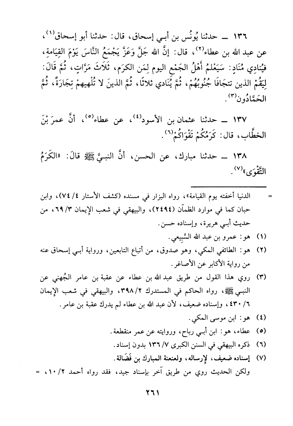 137 - حَدَّثَنَا عُثْمَانُ بْنُ الْأَسْوَدِ، عَنْ عَطَاءٍ، أَنَّ عُمَرَ بْنَ الْخَطَّابِ، قَالَ: «§كَرَمُكُمْ تَقْوَاكُمْ»