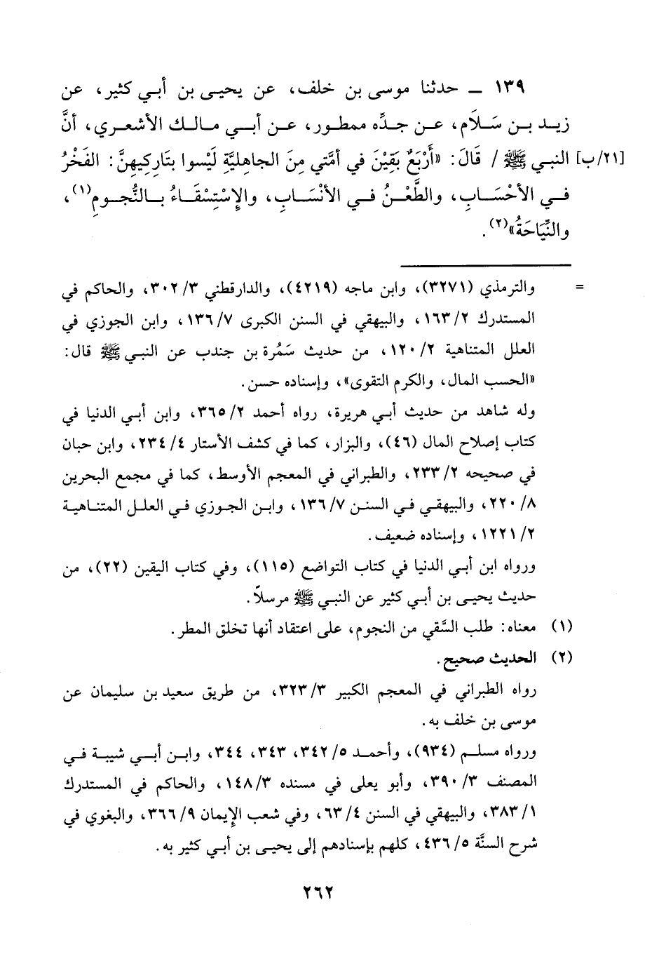 139 - حَدَّثَنَا مُوسَى بْنُ خَلَفٍ، عَنْ يَحْيَى بْنِ أَبِي كَثِيرٍ، عَنْ زَيْدِ بْنِ سَلَّامٍ، عَنْ جَدِّهِ مَمْطُورٍ، عَنْ أَبِي مَالِكٍ الْأَشْعَرِيِّ، أَنَّ النَّبِيَّ صَلَّى اللهُ عَلَيْهِ وَسَلَّمَ قَالَ: " §أَرْبَعٌ بَقِينَ فِي أُمَّتِي مِنَ الْجَاهِلِيَّةِ لَيْسُوا بِتَارِكِيهِنَّ: الْفَخْرُ فِي الْأَحْسَابِ، وَالطَّعْنُ فِي الْأَنْسَابِ، وَالِاسْتِسْقَاءُ بِالنُّجُومِ، وَالنِّيَاحَةُ "