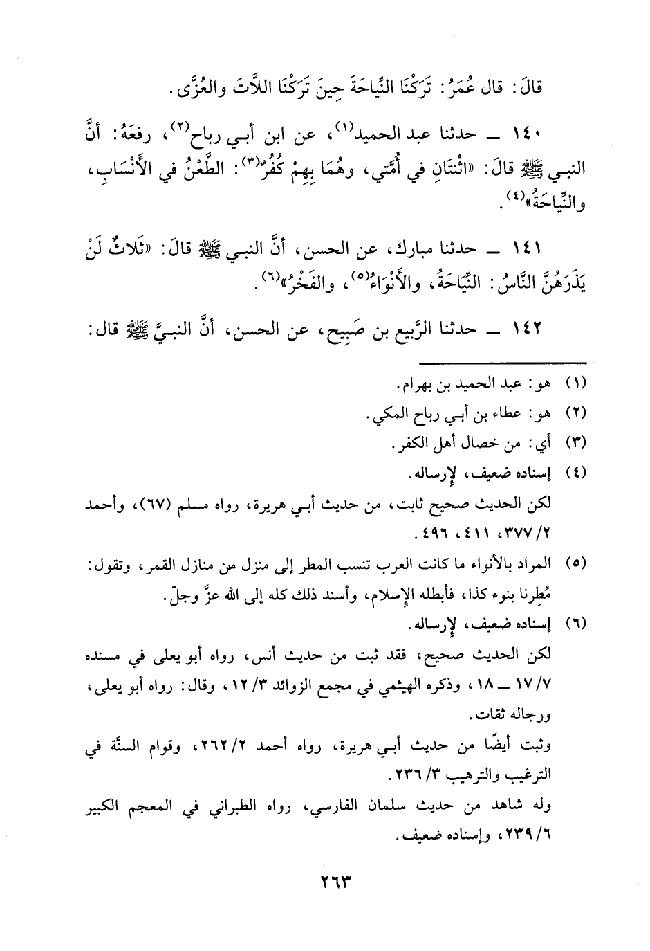 140 - حَدَّثَنَا عَبْدُ الْحَمِيدِ، عَنِ ابْنِ أَبِي رَبَاحٍ، رَفَعَهُ: أَنَّ النَّبِيَّ صَلَّى اللهُ عَلَيْهِ وَسَلَّمَ قَالَ: " §اثْنَتَانِ فِي أُمَّتِي، وَهُمَا بِهِمْ كُفُرٌ: الطَّعْنُ فِي الْأَنْسَابِ، وَالنِّيَاحَةُ "