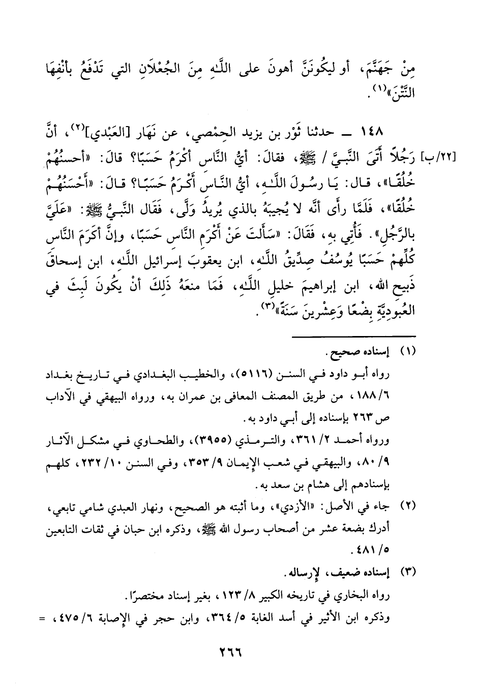 148 - حَدَّثَنَا ثَوْرُ بْنُ يَزِيدَ الْحِمْصِيُّ، عَنْ نَهَارٍ الْعَبْدِيِّ، أَنَّ رَجُلًا أَتَى النَّبِيَّ صَلَّى اللهُ عَلَيْهِ وَسَلَّمَ، فَقَالَ: أَيُّ النَّاسِ أَكْرَمُ حَسَبًا؟ قَالَ: «أَحْسَنُهُمْ خُلُقًا» قَالَ: يَا رَسُولَ اللَّهِ، أَيُّ النَّاسِ أَكْرَمُ حَسَبًا؟ قَالَ: أَحْسَنُهُمْ خُلُقًا "، فَلَمَّا رَأَى أَنَّهُ لَا يُجِيبُهُ بِالَّذِي يُرِيدُ وَلَّى، فَقَالَ النَّبِيُّ صَلَّى اللهُ عَلَيْهِ وَسَلَّمَ: «عَلَيَّ بِالرَّجُلِ» ، فَأُتِيَ بِهِ، فَقَالَ: «سَأَلْتَ عَنْ أَكْرَمِ النَّاسِ حَسَبًا، وَإِنَّ §أَكْرَمَ النَّاسِ كُلِّهِمْ حَسَبًا يُوسُفُ صِدِّيقُ اللَّهِ، ابْنُ يَعْقُوبَ إِسْرَائِيلَ اللَّهِ، ابْنِ إِسْحَاقَ ذَبِيحِ اللَّهِ، ابْنِ إِبْرَاهِيمَ خَلِيلِ اللَّهِ، فَمَا مَنَعَهُ ذَلِكَ أَنْ يَكُونَ لَبِثَ فِي الْعُبُودِيَّةِ بِضْعًا وَعِشْرِينَ سَنَةً»