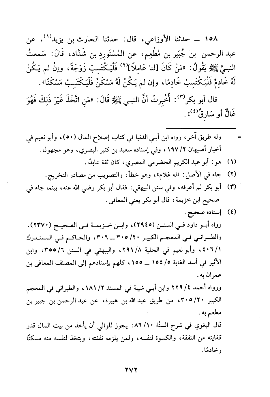 158 - حَدَّثَنَا الْأَوْزَاعِيُّ، قَالَ: حَدَّثَنَا الْحَارِثُ بْنُ يَزِيدَ، عَنْ عَبْدِ الرَّحْمَنِ بْنِ جُبَيْرِ بْنِ مُطْعِمٍ، عَنِ الْمُسْتَوْرِدِ بْنِ شَدَّادٍ، قَالَ: سَمِعْتُ النَّبِيَّ صَلَّى اللهُ عَلَيْهِ وَسَلَّمَ يَقُولُ: «§مَنْ كَانَ لَنَا عَامِلًا فَلْيَكْتَسِبْ زَوْجَةً، وَإِنْ لَمْ يَكُنْ لَهُ خَادِمٌ فَلْيَكْتَسِبْ خَادِمًا، وَإِنْ لَمْ يَكُنْ لَهُ مَسْكَنٌ فَلْيَكْتَسِبْ مَسْكَنًا» . قَالَ أَبُو بَكْرٍ: أُخْبِرْتُ أَنَّ النَّبِيَّ صَلَّى اللهُ عَلَيْهِ وَسَلَّمَ قَالَ: «مَنِ اتَّخَذَ غَيْرَ ذَلِكَ فَهُوَ غَالٌّ أَوْ سَارِقٌ» . -[273]-