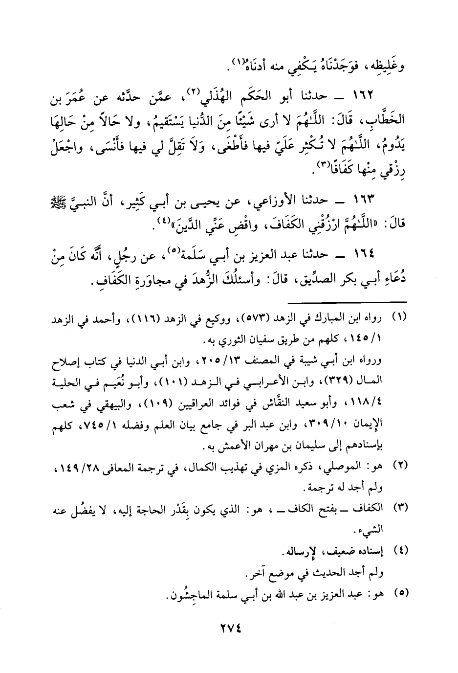 164 - حَدَّثَنَا عَبْدُ الْعَزِيزِ بْنُ أَبِي سَلَمَةَ، عَنْ رَجُلٍ، أَنَّهُ كَانَ مِنْ دُعَاءِ أَبِي بَكْرٍ الصِّدِّيقِ، قَالَ: «§وَأَسْأَلُكَ الزُّهْدِ فِي مُجَاوِرَةِ الْكَفَافِ»