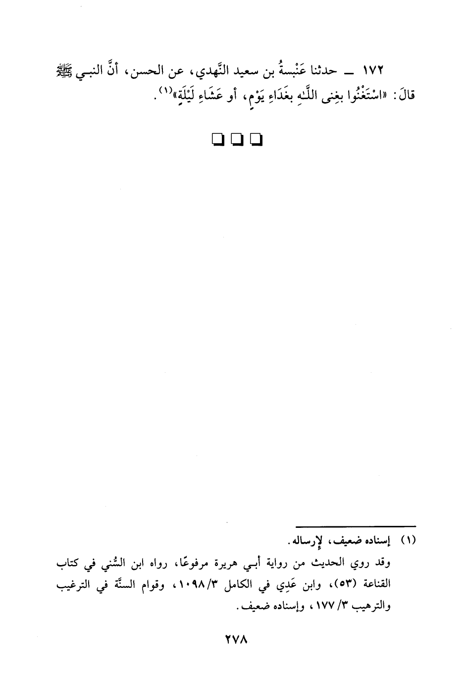 172 - حَدَّثَنَا عَنْبَسَةُ بْنُ سَعِيدٍ النَّهْدِيُّ، عَنِ الْحَسَنِ، أَنَّ النَّبِيَّ صَلَّى اللهُ عَلَيْهِ وَسَلَّمَ قَالَ: «§اسْتَغْنُوا بِغِنَى اللَّهِ، بِغَدَاءِ يَوْمٍ، أَوْ عِشَاءِ لَيْلَةٍ»
