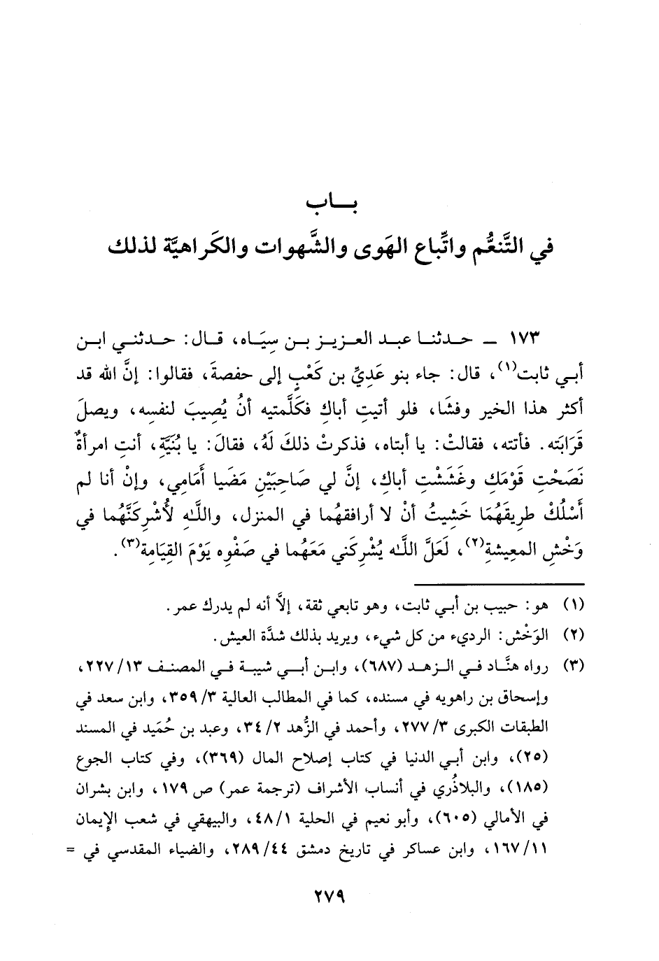 173 - حَدَّثَنَا عَبْدُ الْعَزِيزِ بْنُ سِيَاهٍ، قَالَ: حَدَّثَنِي ابْنُ أَبِي ثَابِتٍ، قَالَ: جَاءَ بَنُو عَدِيِّ بْنِ كَعْبٍ إِلَى حَفْصَةَ، فَقَالُوا: إِنَّ اللَّهَ قَدْ أَكْثَرَ هَذَا الْخَيْرَ وَفَشَا، فَلَوْ أَتَيْتِ أَبَاكِ فَكَلَّمْتِيهِ أَنْ يُصِيبَ لِنَفْسِهِ، وَيَصِلَ قَرَابَتَهُ. فَأَتَتْهُ، فَقَالَتْ: يَا أَبَتَاهُ، فَذَكَرْتُ ذَلِكَ لَهُ، فَقَالَ: يَا بُنَيَّةُ، أَنْتِ امْرَأَةٌ نَصَحْتِ قَوْمَكِ وَغَشَشْتِ أَبَاكِ، إِنَّ لِي صَاحِبَيْنِ مَضَيَا أَمَامِي، وَإِنْ أَنَا لَمْ أَسْلُكْ طَرِيقَهُمَا خَشِيتُ أَنْ لَا أُرَافِقَهُمَا فِي الْمَنْزِلِ، وَاللَّهِ §لَأُشْرِكَنَّهُمَا فِي وَخْشِ الْمَعِيشَةِ، لَعَلَّ اللَّهَ يُشْرِكُنِي مَعَهُمَا فِي صَفْوِهِ يَوْمَ الْقِيَامَةِ "