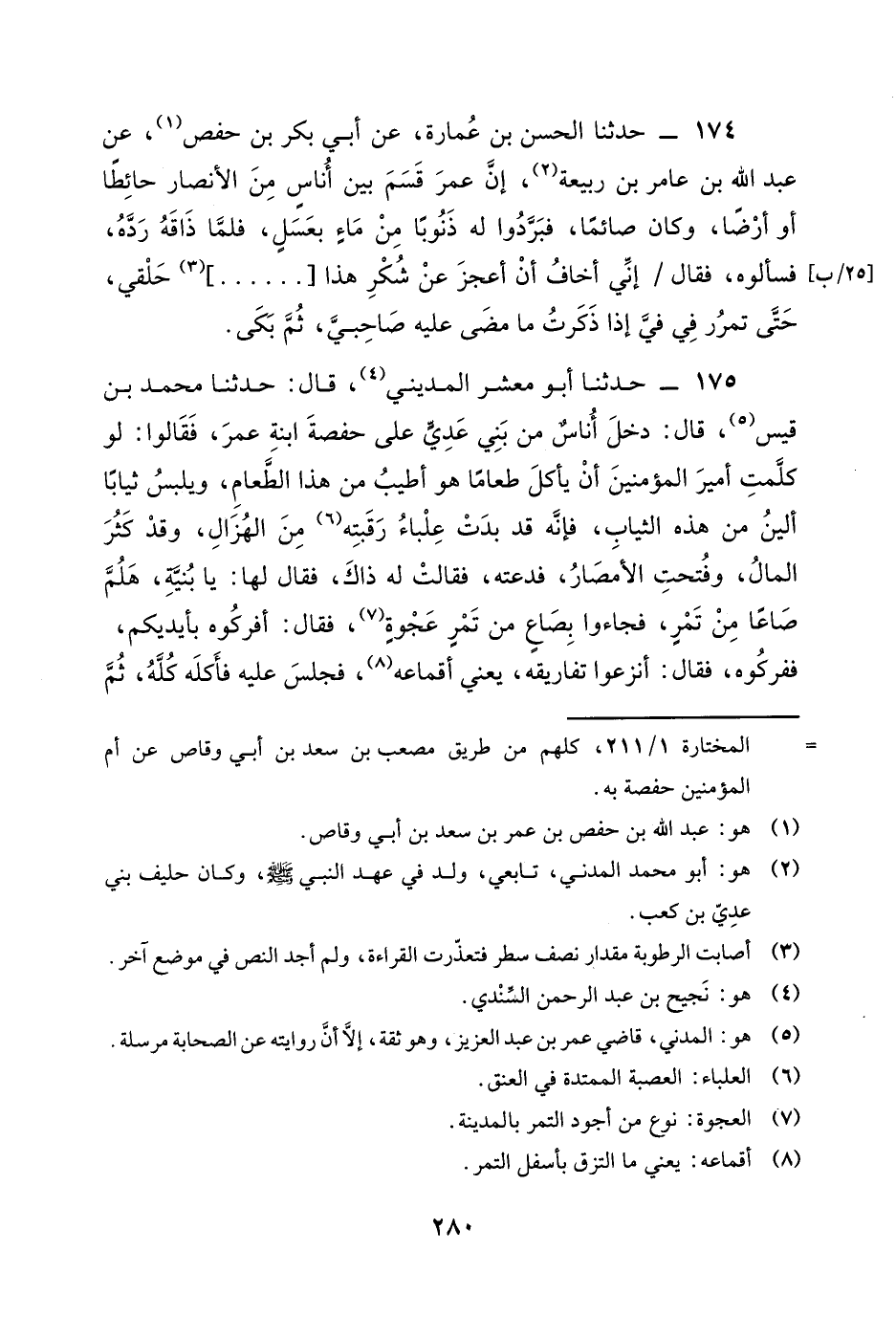175 - حَدَّثَنَا أَبُو مَعْشَرٍ الْمَدِينِيُّ، قَالَ: حَدَّثَنَا مُحَمَّدُ بْنُ قَيْسٍ، قَالَ: دَخَلَ أُنَاسٌ مِنْ بَنِي عَدِيٍّ عَلَى حَفْصَةَ ابْنَةِ عُمَرَ، فَقَالُوا: لَوْ كَلَّمْتَ أَمِيرَ الْمُؤْمِنِينَ أَنْ يَأْكُلَ طَعَامًا هُوَ أَطْيَبُ مِنْ هَذَا الطَّعَامِ، وَيَلْبَسُ ثِيَابًا أَلْيَنُ مِنْ هَذِهِ الثِّيَابِ، فَإِنَّهُ قَدْ بَدَتْ عِلْبَاءُ رَقَبَتِهِ مِنَ الْهُزَالِ، وَقَدْ كَثُرَ الْمَالُ، وَفُتِحَتِ الْأَمْصَارُ، فَدَعَتْهُ، فَقَالَتْ لَهُ ذَاكَ، فَقَالَ لَهَا: يَا بُنَيَّةُ، هَلُمَّ صَاعًا مِنْ تَمْرٍ، فَجَاءُوا بِصَاعٍ مِنْ تَمْرٍ عَجْوَةٍ، فَقَالَ: افْرُكُوهُ بِأَيْدِيكُمْ، فَفَرَكُوهُ، فَقَالَ: انْزِعُوا تَفَارِيقَهُ، يَعْنِي أَقْمَاعَهُ، فَجَلَسَ عَلَيْهِ فَأَكَلَهُ كُلَّهُ، ثُمَّ -[281]- قَالَ: " أَتُرَوْنِي لَا أَشْتَهِي الطَّعَامَ، إِنِّي لَآكُلُ الْخُبْزَ وَاللَّحْمَ، ثُمَّ إِنِّي لَأَتْرُكُ اللَّحْمَ وَهُوَ عِنْدِي، فَلَا آكُلُ بِهِ، وَآكُلُ بِالسَّمْنِ، ثُمَّ إِنِّي لَأَتْرُكُ السَّمْنَ وَهُوَ عِنْدِي، فَلَا آكُلُ بِهِ، وَلَوْ شِئْتُ لَأَكَلْتُ، وَلَكِنِّي أَتْرُكُهُ وَآكُلُ بِالزَّيْتِ، ثُمَّ إِنِّي لَأَتْرُكُ الزَّيْتَ وَهُوَ عِنْدِي، لَا آكُلُ بِهِ، وَآكُلُ بِالْمِلْحِ، وَإِنِّي لَأَتْرُكُ الْمِلْحَ وَهُوَ عِنْدِي، وَإِنَّ الْمِلْحَ لَإِدَامٌ، وَلَوْ شِئْتُ لَأَكَلْتُهُ بِهِ، وَأُكْثِرُ أَكْلَ قَفَارٍ، أَبْتَغِي مَا عِنْدَ اللَّهِ. يَا بُنَيَّةُ، §أَخْبِرِينِي بِأَحْسَنِ ثَوْبٍ لَبِسَهُ رَسُولُ اللَّهِ صَلَّى اللهُ عَلَيْهِ وَسَلَّمَ عِنْدَكِ؟ قَالَتْ: نَمِرَةٌ نُسِجَتْ لَهُ فَلَبِسَهَا، فَقَالَ رَجُلٌ مِنْ أَصْحَابِهِ: اكْسُنِيهَا، فَكَسَاهَا إِيَّاهُ. قَالَ: فَأَخْبِرِينِي بِأَلْيَنِ فِرَاشٍ فَرَشْتِيهِ عِنْدَكِ قَطُّ؟ قَالَتْ: عَبَاءَةٌ كُنَّا ثَنَيْنَاهَا لَهُ فَغَلُظَتْ عَلَيْهِ فَدَبَغْنَاهَا، وَوِسَادَةٌ مِنْ أَدَمٍ مَحْشُوَّةٍ بِلِيفٍ. فَقَالَ: يَا بُنَيَّةُ، مَضَى صَاحِبَايَ عَلَى حَالٍ إِنْ خَالَفْتُهُمَا خُولِفَ بِي عَنْهُمَا، إِذَنْ لَا أَفْعَلُ شَيْئًا مِمَّا تَقُولِينَ "