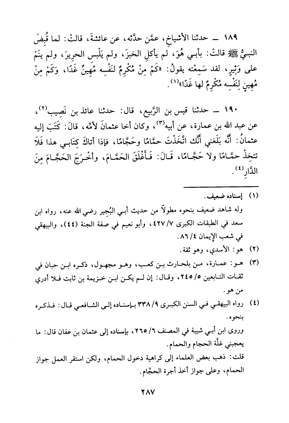 190 - حَدَّثَنَا قَيْسُ بْنُ الرَّبِيعِ، قَالَ: حَدَّثَنَا عَائِذُ بْنُ نَصِيبٍ، عَنْ عَبْدِ اللَّهِ بْنِ عُمَارَةَ، عَنْ أَبِيهِ، وَكَانَ أَخَا عُثْمَانَ لِأُمِّهِ، قَالَ: كَتَبَ إِلَيْهِ عُثْمَانُ: «أَنَّهُ بَلَغَنِي أَنَّكَ اتَّخَذْتَ حَمَّامًا وَحَجَّامًا، §فَإِذَا أَتَاكَ كِتَابِي هَذَا فَلَا تَتَّخِذْ حَمَّامًا وَلَا حَجَّامًا» ، قَالَ: فَأَغْلَقَ الْحَمَّامَ، وَأَخْرَجَ الْحَجَّامَ مِنَ الدَّارِ