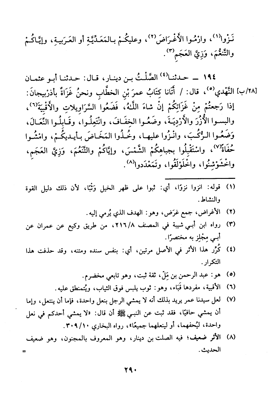 194 - حَدَّثَنَا الصَّلْتُ بْنُ دِينَارٍ، قَالَ: حَدَّثَنَا أَبُو عُثْمَانَ النَّهْدِيُّ، قَالَ: أَتَانَا كِتَابُ عُمَرَ بْنِ الْخَطَّابِ وَنَحْنُ غَزَاةٌ بِأَذْرَبِيجَانَ: «§إِذَا رَجَعْتُمْ مِنْ غَزَاتِكُمْ، إِنْ شَاءَ اللَّهُ، فَضَعُوا السَّرَاوِيلَاتِ وَالْأَقْبِيَةَ، وَالْبَسُوا الْأُزُرَ وَالْأَرْدِيَةَ، وَضَعُوا الْخِفَافَ، وَانْتَعِلُوا، وَقَابِلُوا النِّعَالَ، وَضَعُوا الرُّكُبَ، وَانْزُوا عَلَيْهَا، وَخُذُوا الْمَخَاضَ بِأَيْدِيكُمْ، وَامْشُوا حُفَاةً، وَاسْتَقْبِلُوا بِجِبَاهِكُمُ الشَّمْسَ، وَإِيَّاكُمْ وَالتَّنَعُّمَ، وَزِيَّ الْعَجَمِ، وَاخْشَوْشِنُوا، وَاخْلَوْلِقُوا، وَتَمَعْدَدُوا»