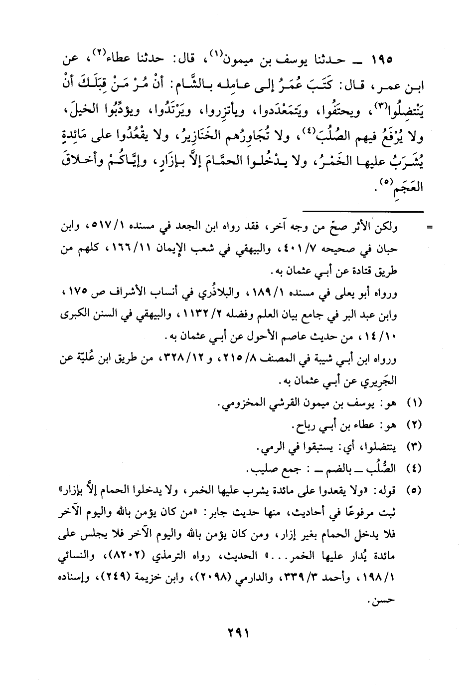 195 - حَدَّثَنَا يُوسُفُ بْنُ مَيْمُونٍ، قَالَ: حَدَّثَنَا عَطَاءٌ، عَنِ ابْنِ عُمَرَ، قَالَ: كَتَبَ عُمَرُ إِلَى عَامِلِهِ بِالشَّامِ: «أَنْ §مُرْ مَنْ قِبَلَكَ أَنْ يَنْتَضِلُوا، وَيَحْتَفُوا، وَيَتَمَعْدَدُوا، وَيَأْتَزِرُوا، وَيَرْتَدُوا، وَيُؤَدِّبُوا الْخَيْلَ، وَلَا يُرْفَعُ فِيهِمُ الصُّلُبُ، وَلَا تُجَاوِرُهُمُ الْخَنَازِيرُ، وَلَا يَقْعُدُوا عَلَى مَائِدَةٍ يُشْرَبُ عَلَيْهَا الْخَمْرُ، وَلَا يَدْخُلُوا الْحَمَّامَ إِلَّا بِإِزَارٍ، وَإِيَّاكُمْ وَأَخْلَاقَ الْعَجَمِ»