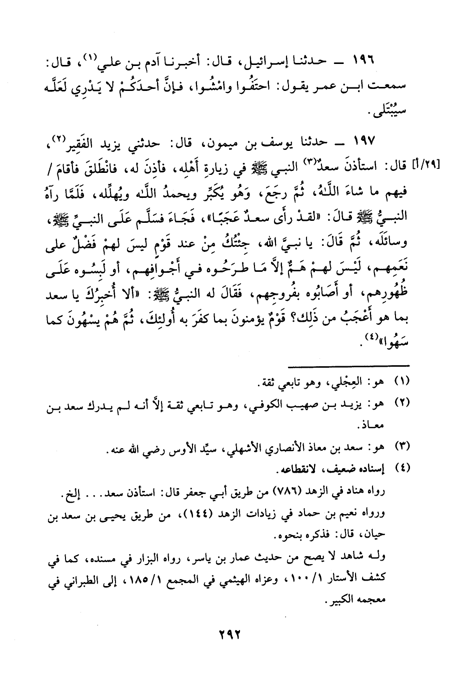 197 - حَدَّثَنَا يُوسُفُ بْنُ مَيْمُونٍ، قَالَ: حَدَّثَنِي يَزِيدُ الْفَقِيرُ، قَالَ: اسْتَأْذَنَ سَعْدٌ النَّبِيَّ صَلَّى اللهُ عَلَيْهِ وَسَلَّمَ فِي زِيَارَةِ أَهْلِهِ، فَأَذِنَ لَهُ، فَانْطَلَقَ فَأَقَامَ فِيهِمْ مَا شَاءَ اللَّهُ، ثُمَّ رَجَعَ وَهُوَ يُكَبِّرُ وَيَحْمَدُ اللَّهَ وَيُهَلِّلُهُ، فَلَمَّا رَآهُ النَّبِيُّ صَلَّى اللهُ عَلَيْهِ وَسَلَّمَ قَالَ: «لَقَدْ رَأَى سَعْدٌ عَجَبًا» . فَجَاءَ فَسَلَّمَ عَلَى النَّبِيِّ صَلَّى اللهُ عَلَيْهِ وَسَلَّمَ وَسَاءَلَهُ، ثُمَّ قَالَ: يَا نَبِيَّ اللَّهِ، جِئْتُكَ مِنْ عِنْدِ قَوْمٍ لَيْسَ لَهُمْ فَضْلٌ عَلَى نَعَمِهِمْ، لَيْسَ لَهُمْ هَمٌّ إِلَّا مَا طَرَحُوهُ فِي أَجْوَافِهِمْ، أَوْ لَبِسُوهُ عَلَى ظُهُورِهِمْ، أَوْ أَصَابُوهُ بِفُرُوجِهِمْ، فَقَالَ لَهُ النَّبِيُّ صَلَّى اللهُ عَلَيْهِ وَسَلَّمَ: «§أَلَا أُخْبِرُكَ يَا سَعْدُ بِمَا هُوَ أَعْجَبُ مِنْ ذَلِكَ؟ قَوْمٌ يُؤْمِنُونَ بِمَا كَفَرَ بِهِ أُولَئِكَ، ثُمَّ هُمْ يَسْهُونَ كَمَا سَهَوْا»