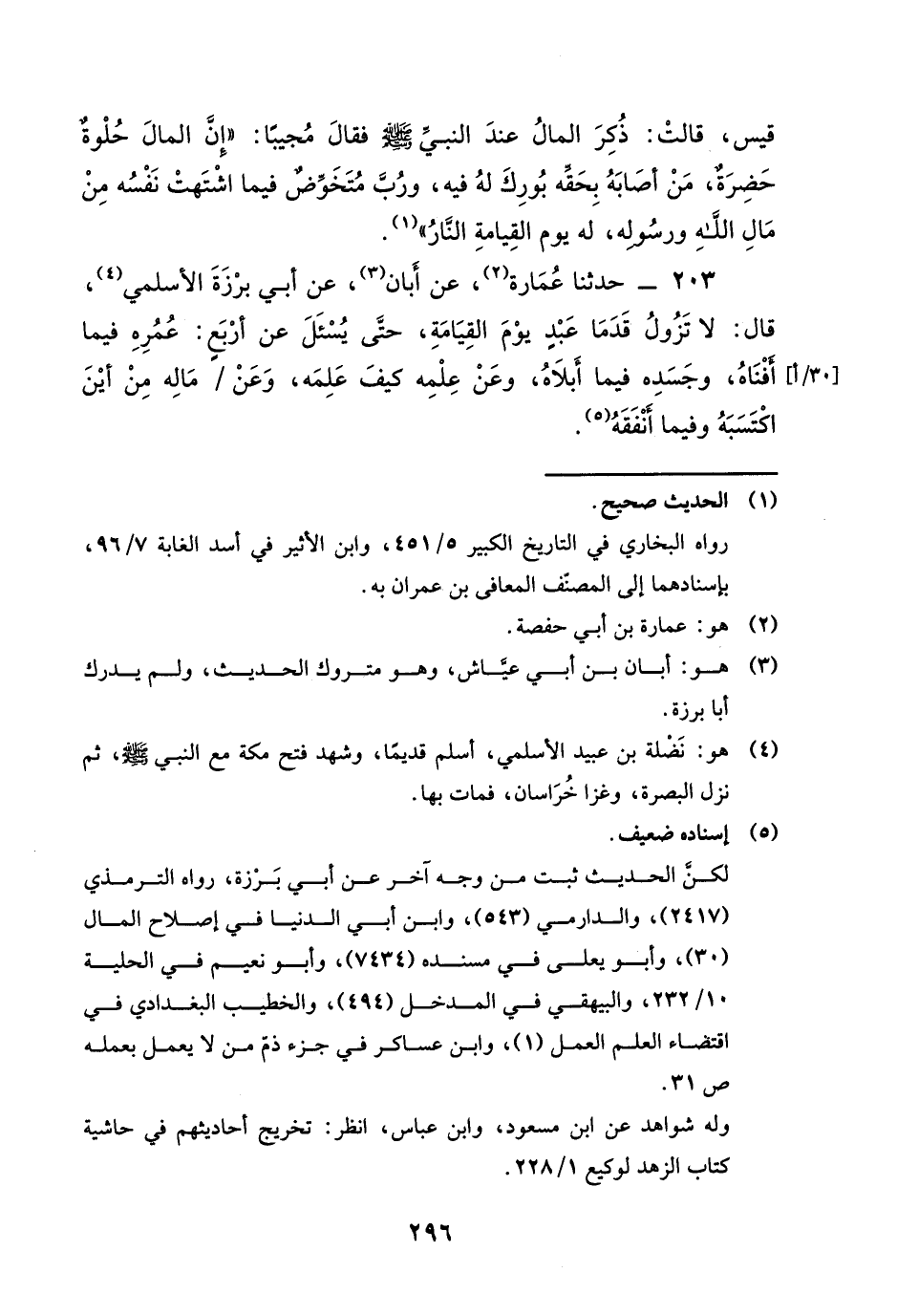 203 - حَدَّثَنَا عُمَارَةُ، عَنْ أَبَانَ، عَنْ أَبِي بَرْزَةَ الْأَسْلَمِيِّ، قَالَ: " §لَا تَزُولُ قَدَمَا عَبْدٍ يَوْمَ الْقِيَامَةِ، حَتَّى يُسْأَلَ عَنْ أَرْبَعٍ: عُمُرِهِ فِيمَا أَفْنَاهُ، وَجَسَدِهِ فِيمَا أَبْلَاهُ، وَعَنْ عِلْمِهِ كَيْفَ عَلِمَهُ، وَعَنْ مَالِهِ مِنْ أَيْنَ اكْتَسَبَهُ وَفِيمَا أَنْفَقَهُ ". -[297]-
