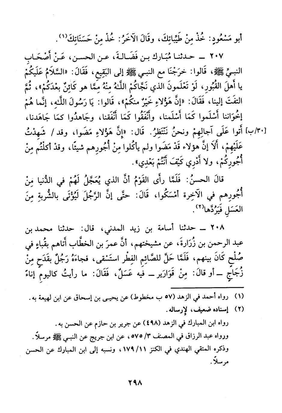 207 - حَدَّثَنَا مُبَارَكُ بْنُ فَضَالَةَ، عَنِ الْحَسَنِ، عَنْ أَصْحَابِ النَّبِيِّ، صَلَّى اللهُ عَلَيْهِ وَسَلَّمَ قَالُوا: خَرَجْنَا مَعَ النَّبِيِّ صَلَّى اللهُ عَلَيْهِ وَسَلَّمَ إِلَى الْبَقِيعِ، فَقَالَ: «السَّلَامُ عَلَيْكُمْ يَا أَهْلَ الْقُبُورِ، §لَوْ تَعْلَمُونَ الَّذِي نَجَّاكُمُ اللَّهُ مِنْهُ مِمَّا هُوَ كَائِنٌ بَعْدَكُمْ» ، ثُمَّ الْتَفَتَ إِلَيْنَا، فَقَالَ: «إِنَّ هَؤُلَاءِ خَيْرٌ مِنْكُمْ» ، قَالُوا: يَا رَسُولَ اللَّهِ، إِنَّمَا هُمْ إِخْوَانُنَا أَسْلَمُوا كَمَا أَسْلَمْنَا، وَأَنْفَقُوا كَمَا أَنْفَقْنَا، وَجَاهَدُوا كَمَا جَاهَدْنَا، أَتَوْا عَلَى آجَالِهِمْ وَنَحْنُ نَنْتَظِرُ. قَالَ: «إِنَّ هَؤُلَاءِ مَضَوْا، وَقَدْ شَهِدْتُ عَلَيْهِمْ، أَلَا إِنَّ هَؤُلَاءِ قَدْ مَضَوْا وَلَمْ يَأْكُلُوا مِنْ أُجُورِهِمْ شَيْئًا، وَقَدْ أَكَلْتُمْ مِنْ أُجُورِكُمْ، وَلَا أَدْرِي كَيْفَ أَنْتُمْ بَعْدِي» . قَالَ الْحَسَنُ: فَلَمَّا رَأَى الْقَوْمُ أَنَّ الَّذِي يُعَجَّلُ لَهُمْ فِي الدُّنْيَا مِنْ أُجُورِهِمْ فِي الْآخِرَةِ أَمْسَكُوا، قَالَ: حَتَّى إِنَّ الرَّجُلَ لِيُؤْتَى بِالشَّرْبَةِ مِنَ الْعَسَلِ فَيَرُدُّهَا