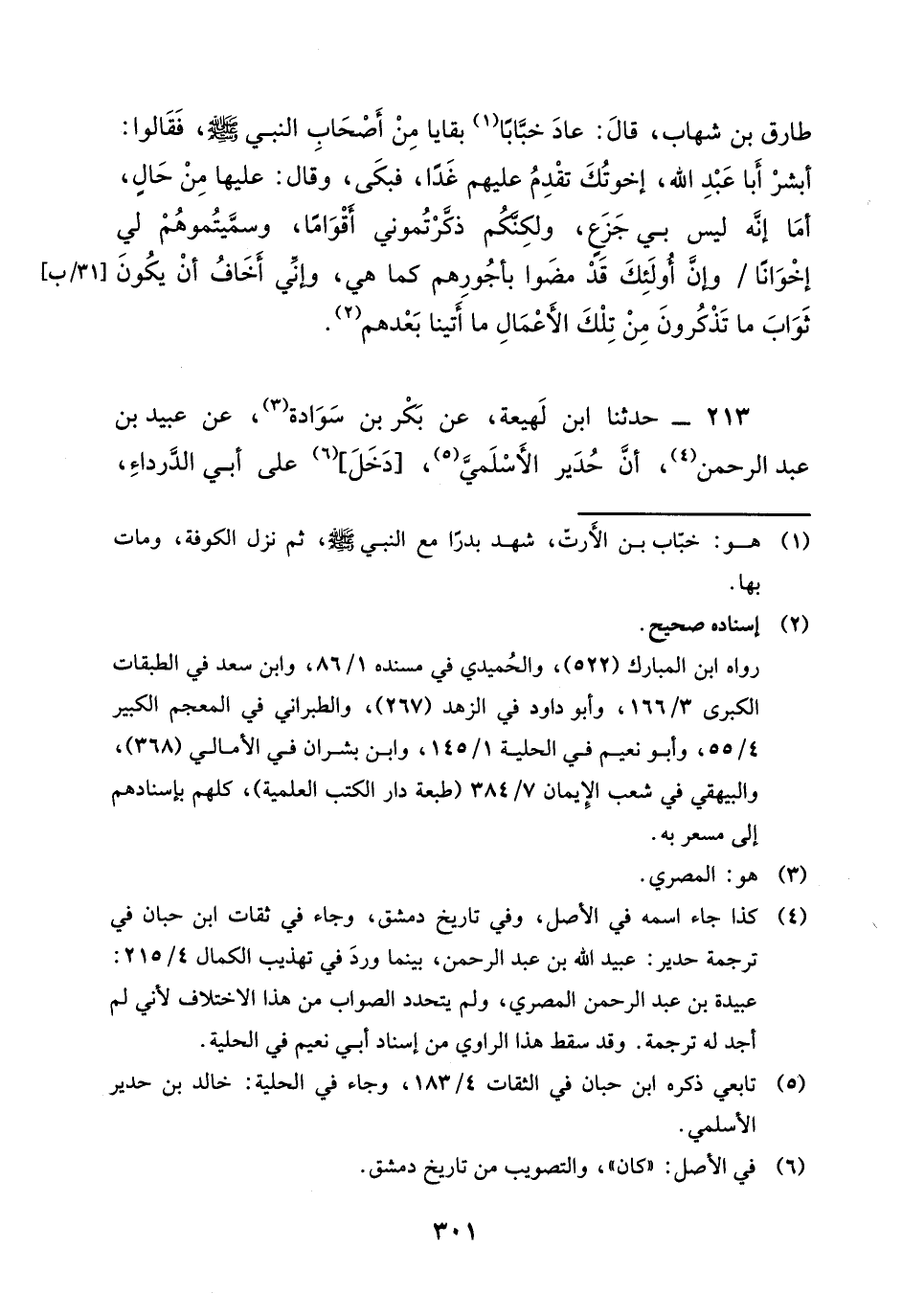 213 - حَدَّثَنَا ابْنُ لَهِيعَةَ، عَنْ بَكْرِ بْنِ سَوَادَةَ، عَنْ عُبَيْدِ بْنِ عَبْدِ الرَّحْمَنِ، أَنَّ حُدَيْرًا الْأَسْلَمِيَّ، دَخَلَ عَلَى أَبِي الدَّرْدَاءِ، -[302]- وَتَحْتَهُ فِرَاشُ جَلْدٍ، وَسَبَنِيَّةُ صُوفٍ، وَهُوَ وَجِعٌ وَقَدْ عَرَقَ، فَقَالَ لَهُ حُدَيْرٌ: مَا مَنَعَكَ أَنْ تَكْتَسِبَ فِرَاشًا بِوَرِقٍ، وَكِسَاءَ خَزٍّ، وَقَطِيفَةَ خَزٍّ، مِمَّا يُعْطِيكَ مُعَاوِيَةُ؟ قَالَ أَبُو الدَّرْدَاءِ: «إِنَّ §لَنَا دَارًا لَهَا نَعْمَلُ، وَإِلَيْهَا نَظْعَنُ، وَإِنَّ الْمُخَفِّفَ فِيهَا أَفْضَلُ مِنَ الْمُثَقِّلِ»