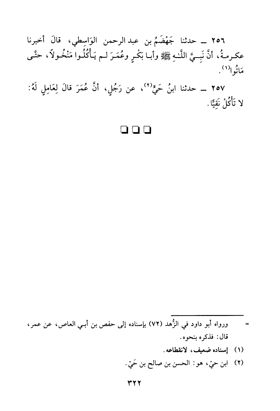 256 - حَدَّثَنَا جَهْضَمُ بْنُ عَبْدِ الرَّحْمَنِ الْوَاسِطِيُّ، قَالَ: أَخْبَرَنَا عِكْرِمَةُ: «§أَنَّ نَبِيَّ اللَّهِ صَلَّى اللهُ عَلَيْهِ وَسَلَّمَ وَأَبَا بَكْرٍ وَعُمَرَ لَمْ يَأْكُلُوا مَنْخُولًا حَتَّى مَاتُوا»