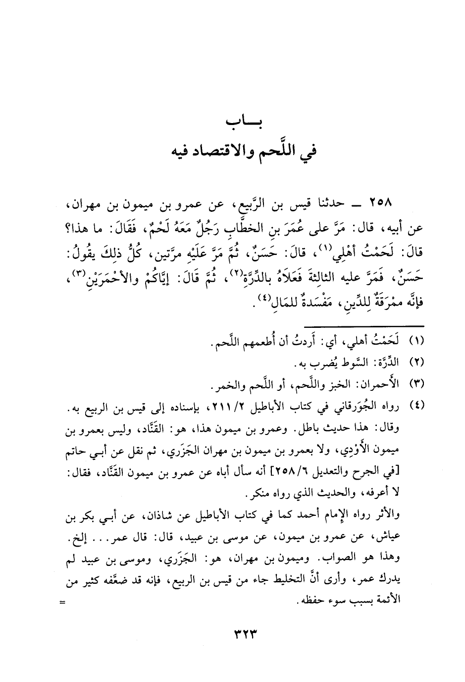 258 - حَدَّثَنَا قَيْسُ بْنُ الرَّبِيعِ، عَنْ عَمْرِو بْنِ مَيْمُونِ بْنِ مِهْرَانَ، عَنْ أَبِيهِ، قَالَ: مَرَّ عَلَى عُمَرَ بْنِ الْخَطَّابِ رَجُلٌ مَعَهُ لَحْمٌ، فَقَالَ: «مَا هَذَا؟» قَالَ: لَحَمْتُ أَهْلِي، قَالَ: «حَسَنٌ» ، ثُمَّ مَرَّ عَلَيْهِ مَرَّتَيْنِ، كُلُّ ذَلِكَ يَقُولُ: «حَسَنٌ» ، فَمَرَّ عَلَيْهِ الثَّالِثَةَ فَعَلَاهُ بِالدِّرَّةِ، ثُمَّ قَالَ: «§إِيَّاكُمْ وَالْأَحْمَرَيْنِ، فَإِنَّهُ مَمْرَقَةٌ لِلدِّينِ، مَفْسَدَةٌ لِلْمَالِ»