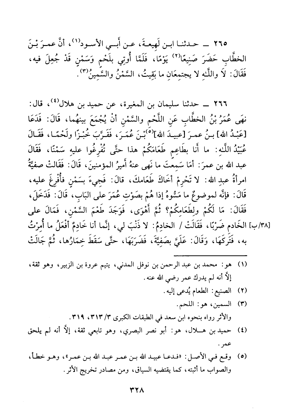 266 - حَدَّثَنَا سُلَيْمَانُ بْنُ الْمُغِيرَةِ، عَنْ حُمَيْدِ بْنِ هِلَالٍ، قَالَ: " §نَهَى عُمَرُ بْنُ الْخَطَّابِ عَنِ اللَّحْمِ وَالسَّمْنِ أَنْ يُجْمَعَ بَيْنَهُمَا، قَالَ: فَدَعَا عَبْدُ اللَّهِ بْنُ عُمَرَ عُبَيْدَ اللَّهِ بْنَ عُمَرَ، فَقَرَّبَ خُبْزًا وَلَحْمًا، فَقَالَ عُبَيْدُ اللَّهِ: مَا أَنَا بِطَاعِمٍ طَعَامَكُمْ هَذَا حَتَّى تُفْرِغُوا عَلَيْهِ سَمْنًا، فَقَالَ عَبْدُ اللَّهِ بْنُ عُمَرَ: أَمَا سَمِعْتَ مَا نَهَى عَنْهُ أَمِيرُ الْمُؤْمِنِينَ؟ قَالَ: فَقَالَتْ صَفِيَّةُ امْرَأَةُ عَبْدِ اللَّهِ: لَا تَحْرِمْ أَخَاكَ طَعَامَكَ، قَالَ: فَجِيءَ بِسَمْنٍ فَأُفْرِغَ عَلَيْهِ، قَالَ: فَإِنَّهُ لَمَوْضُوعٌ مَا مَسُّوهُ إِذَا هُمْ بِصَوْتِ عُمَرَ عَلَى الْبَابِ، قَالَ: فَدَخَلَ، فَقَالَ: «مَا لَكُمْ وَلِطَعَامِكُمْ؟» ثُمَّ أَهْوَى، فَوَجَدَ طَعْمَ السَّمْنِ، فَمَالَ عَلَى الْخَادِمِ ضَرْبًا، فَقَالَتِ الْخَادِمُ: لَا ذَنْبَ لِي، إِنَّمَا أَنَا خَادِمٌ أَفْعَلُ مَا أُمِرْتُ بِهِ، فَتَرَكَهَا، وَقَالَ: «عَلَيَّ بِصَفِيَّةَ، فَضَرَبَهَا، حَتَّى سَقَطَ خِمَارُهَا، ثُمَّ جَالَتْ -[329]- إِلَى الْبَيْتِ تَسْعَى، فَأَغْلَقَتِ الْبَابَ دُونَهُ»