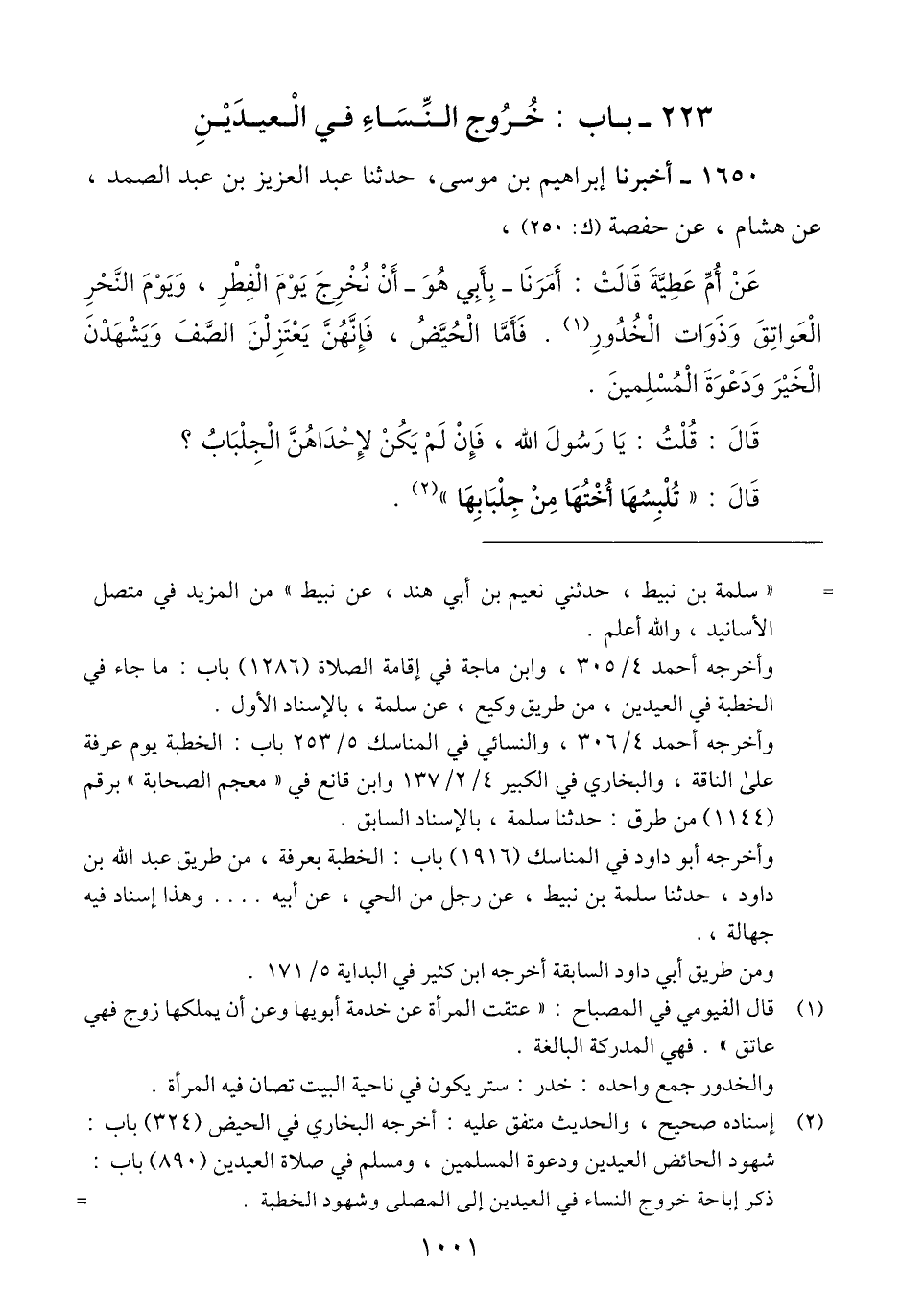 1650 - أَخْبَرَنَا إِبْرَاهِيمُ بْنُ مُوسَى، حَدَّثَنَا عَبْدُ الْعَزِيزِ بْنُ عَبْدِ الصَّمَدِ، عَنْ هِشَامٍ، عَنْ حَفْصَةَ، عَنْ أُمِّ عَطِيَّةَ قَالَتْ: أَمَرَنَا - بِأَبِي هُوَ - أَنْ نُخْرِجَ يَوْمَ الْفِطْرِ، وَيَوْمَ النَّحْرِ الْعَوَاتِقَ وَذَوَاتِ الْخُدُورِ. فَأَمَّا الْحُيَّضُ، فَإِنَّهُنَّ يَعْتَزِلْنَ الصَّفَّ وَيَشْهَدْنَ الْخَيْرَ وَدَعْوَةَ الْمُسْلِمِينَ، قَالَتْ: قُلْتُ: يَا رَسُولَ اللَّهِ، فَإِنْ لَمْ يَكُنْ لِإِحْدَاهُنَّ الْجِلْبَابُ؟ قَالَ: «§تُلْبِسُهَا أُخْتُهَا مِنْ جِلْبَابِهَا» Qإسناده صحيح
