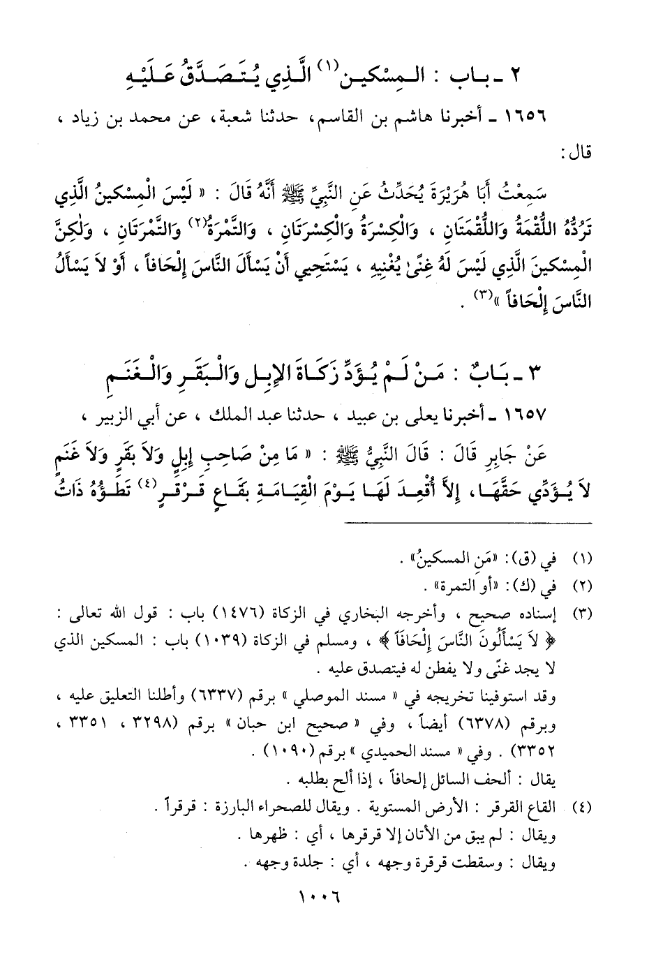 1656 - أَخْبَرَنَا هَاشِمُ بْنُ الْقَاسِمِ، حَدَّثَنَا شُعْبَةُ، عَنْ مُحَمَّدِ بْنِ زِيَادٍ، قَالَ: سَمِعْتُ أَبَا هُرَيْرَةَ يُحَدِّثُ، عَنِ النَّبِيِّ صَلَّى اللهُ عَلَيْهِ وَسَلَّمَ أَنَّهُ قَالَ: «§لَيْسَ الْمِسْكِينُ الَّذِي تَرُدُّهُ اللُّقْمَةُ وَاللُّقْمَتَانِ، وَالْكِسْرَةُ وَالْكِسْرَتَانِ، وَالتَّمْرَةُ وَالتَّمْرَتَانِ، وَلَكِنِ الْمِسْكِينُ الَّذِي لَيْسَ لَهُ غِنًى يُغْنِيهِ، يَسْتَحْيِي أَنْ يَسْأَلَ النَّاسَ إِلْحَافًا - أَوْ لَا يَسْأَلُ النَّاسَ إِلْحَافًا -» Qإسناده صحيح