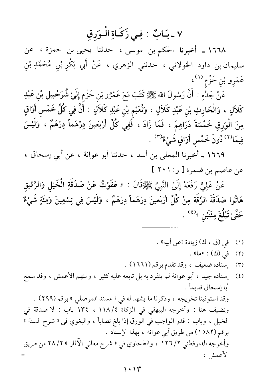 1668 - أَخْبَرَنَا الْحَكَمُ بْنُ مُوسَى، حَدَّثَنَا يَحْيَى بْنُ حَمْزَةَ، عَنْ سُلَيْمَانَ بْنِ دَاوُدَ الْخَوْلَانِيِّ، حَدَّثَنِي الزُّهْرِيُّ، عَنْ أَبِي بَكْرِ بْنِ مُحَمَّدِ بْنِ عَمْرِو بْنِ حَزْمٍ، عَنْ أَبِيهِ، عَنْ جَدِّهِ، " أَنَّ رَسُولَ اللَّهِ صَلَّى اللهُ عَلَيْهِ وَسَلَّمَ كَتَبَ مَعَ عَمْرِو بْنِ حَزْمٍ إِلَى شُرَحْبِيلَ بْنِ عَبْدِ كُلَالٍ، وَالْحَارِثِ بْنِ عَبْدِ كُلَالٍ، وَنُعَيْمِ بْنِ عَبْدِ كُلَالٍ: إِنَّ §فِي كُلِّ خَمْسِ أَوَاقٍ مِنَ الْوَرِقِ خَمْسَةَ دَرَاهِمَ، فَمَا زَادَ، فَفِي كُلِّ أَرْبَعِينَ دِرْهَمًا دِرْهَمٌ، وَلَيْسَ فِيمَا دُونَ خَمْسِ أَوَاقٍ شَيْءٌ "Qإسناده ضعيف