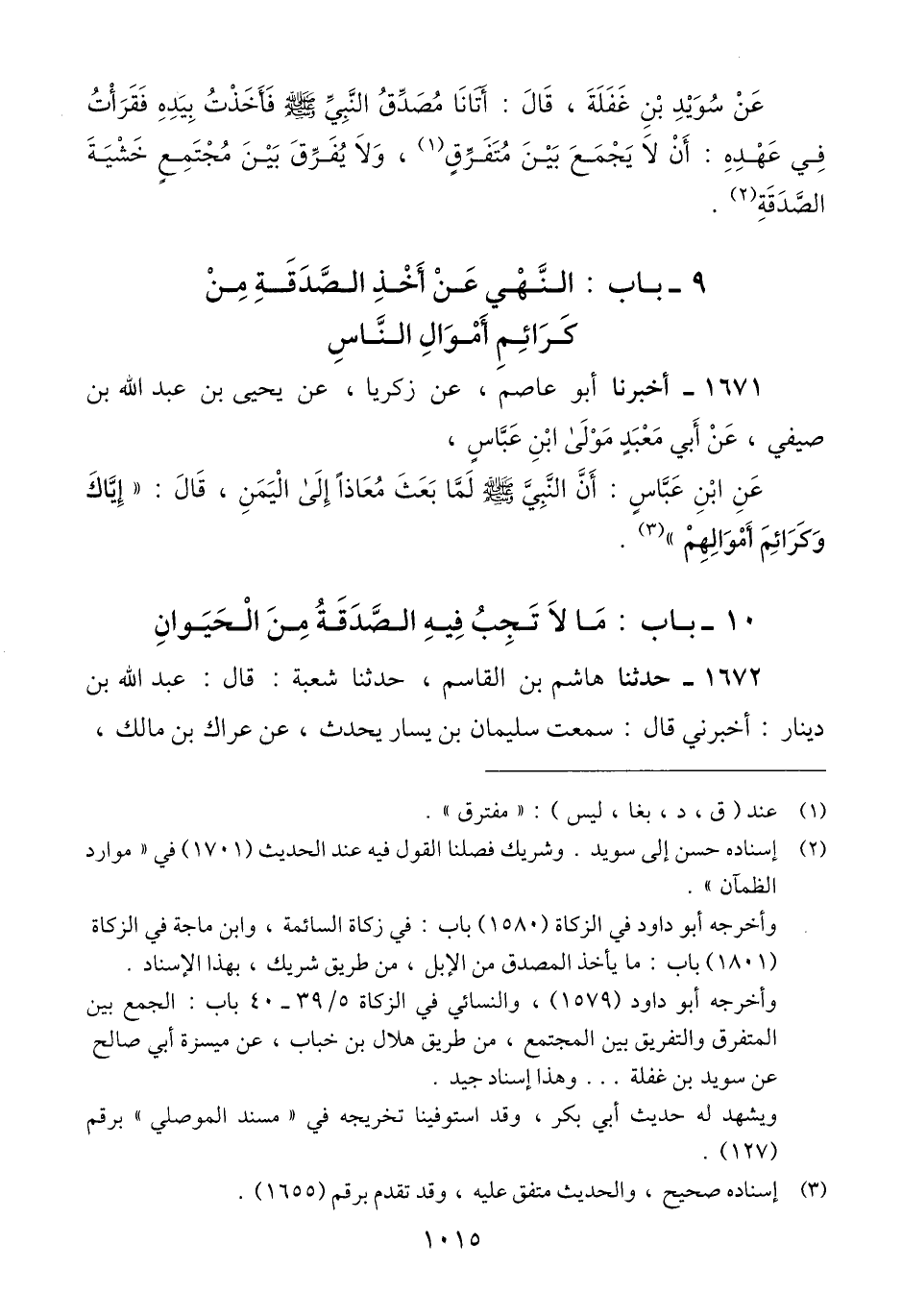 1671 - أَخْبَرَنَا أَبُو عَاصِمٍ، عَنْ زَكَرِيَّا، عَنْ يَحْيَى بْنِ عَبْدِ اللَّهِ بْنِ صَيْفِيٍّ، عَنْ أَبِي مَعْبَدٍ، مَوْلَى ابْنِ عَبَّاسٍ عَنْ ابْنِ عَبَّاسٍ، أَنَّ النَّبِيَّ صَلَّى اللهُ عَلَيْهِ وَسَلَّمَ لَمَّا بَعَثَ مُعَاذًا إِلَى الْيَمَنِ قَالَ: «§إِيَّاكَ وَكَرَائِمَ أَمْوَالِهِمْ»