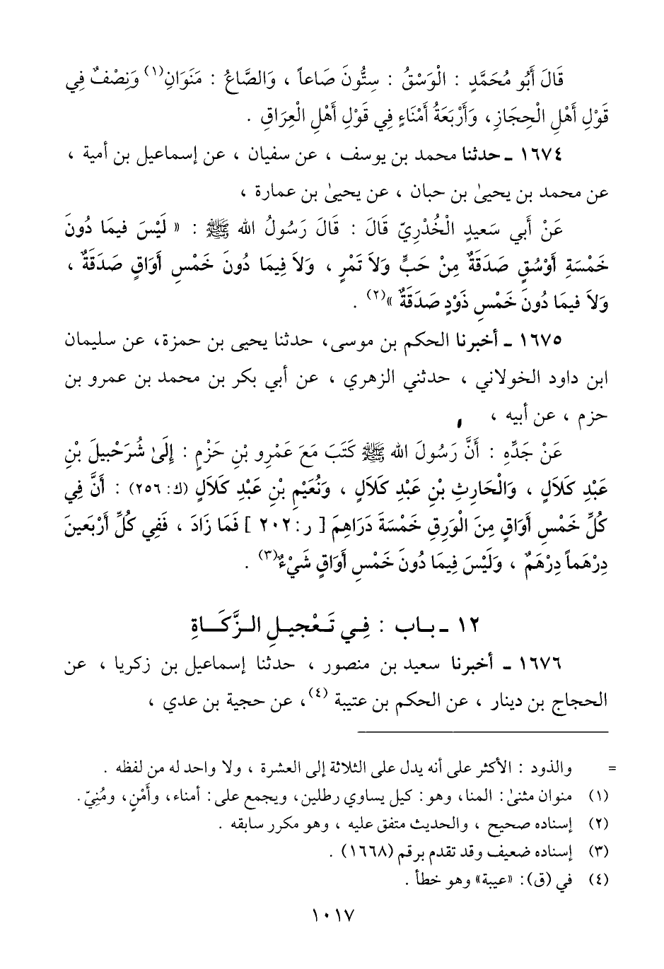 1674 - حَدَّثَنَا مُحَمَّدُ بْنُ يُوسُفَ، عَنْ سُفْيَانَ، عَنْ إِسْمَاعِيلَ بْنِ أُمَيَّةَ، عَنْ مُحَمَّدِ بْنِ يَحْيَى بْنِ حَبَّانَ، عَنْ يَحْيَى بْنِ عُمَارَةَ، عَنْ أَبِي سَعِيدٍ الْخُدْرِيِّ قَالَ: قَالَ رَسُولُ اللَّهِ صَلَّى اللهُ عَلَيْهِ وَسَلَّمَ: «§لَيْسَ فِيمَا دُونَ خَمْسَةِ أَوْسُقٍ صَدَقَةٌ مِنْ حَبٍّ وَلَا تَمْرٍ، وَلَا فِيمَا دُونَ خَمْسِ أَوَاقٍ صَدَقَةٌ، وَلَا فِيمَا دُونَ خَمْسِ ذَوْدٍ صَدَقَةٌ» Qإسناده صحيح
