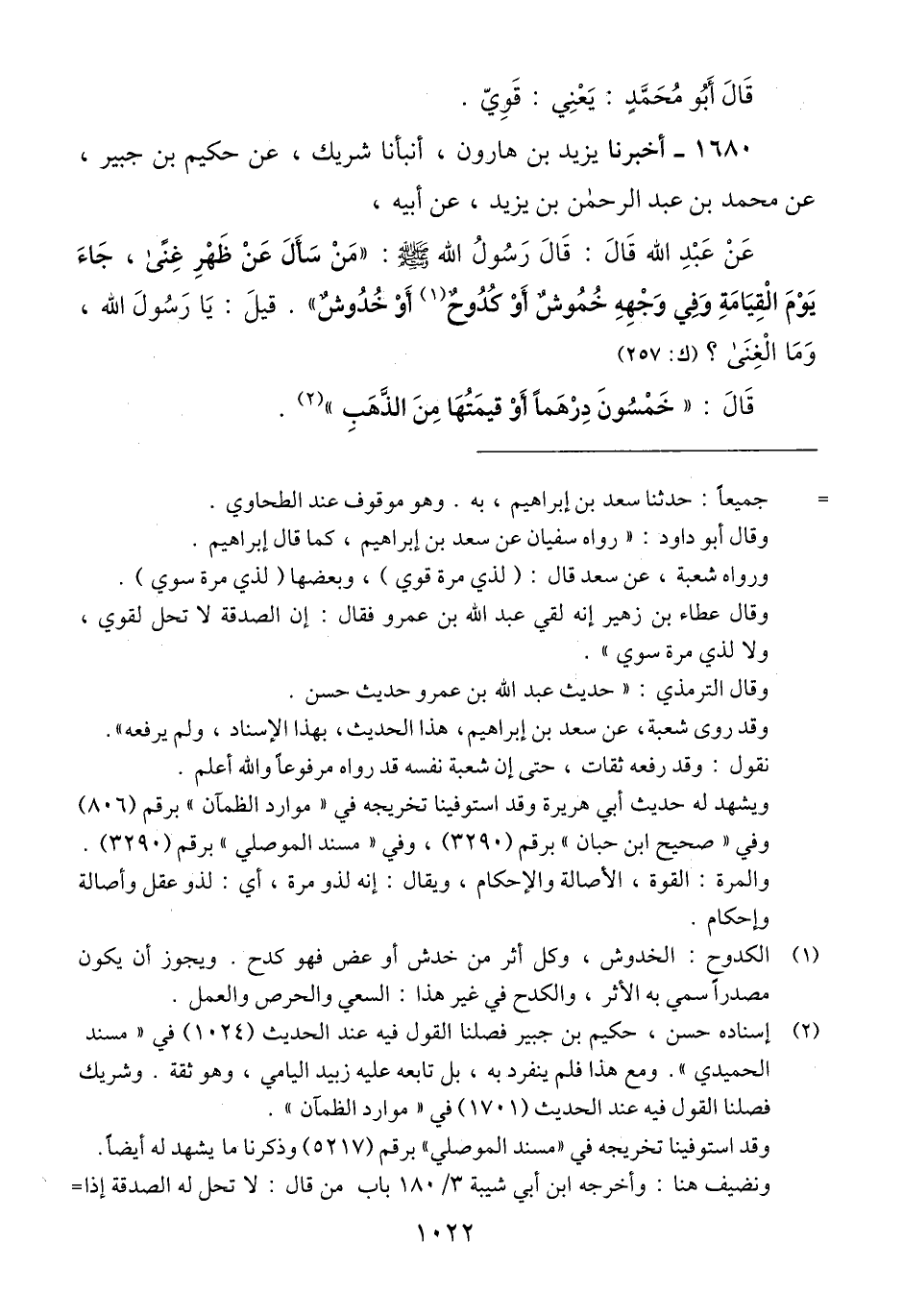 1680 - أَخْبَرَنَا يَزِيدُ بْنُ هَارُونَ، أَنْبَأَنَا شَرِيكٌ، عَنْ حَكِيمِ بْنِ جُبَيْرٍ، عَنْ مُحَمَّدِ بْنِ عَبْدِ الرَّحْمَنِ بْنِ يَزِيدَ، عَنْ أَبِيهِ، عَنْ عَبْدِ اللَّهِ قَالَ: قَالَ رَسُولُ اللَّهِ صَلَّى اللهُ عَلَيْهِ وَسَلَّمَ: «§مَنْ سَأَلَ عَنْ ظَهْرِ غِنًى، جَاءَ يَوْمَ الْقِيَامَةِ وَفِي وَجْهِهِ خُمُوشٌ أَوْ كُدُوحٌ أَوْ خُدُوشٌ». قِيلَ: يَا رَسُولَ اللَّهِ، وَمَا الْغِنَى؟ قَالَ: «خَمْسُونَ دِرْهَمًا، أَوْ قِيمَتُهَا مِنَ الذَّهَبِ» Qإسناده حسن
